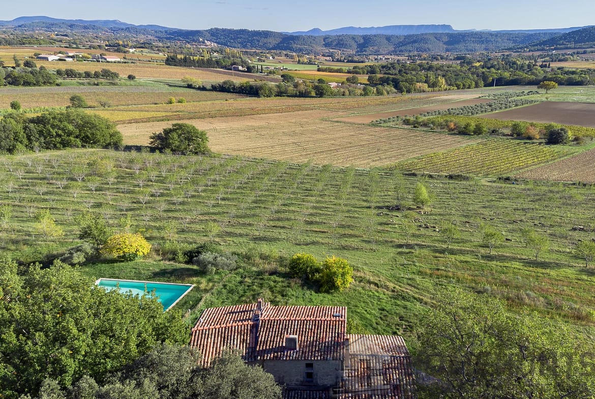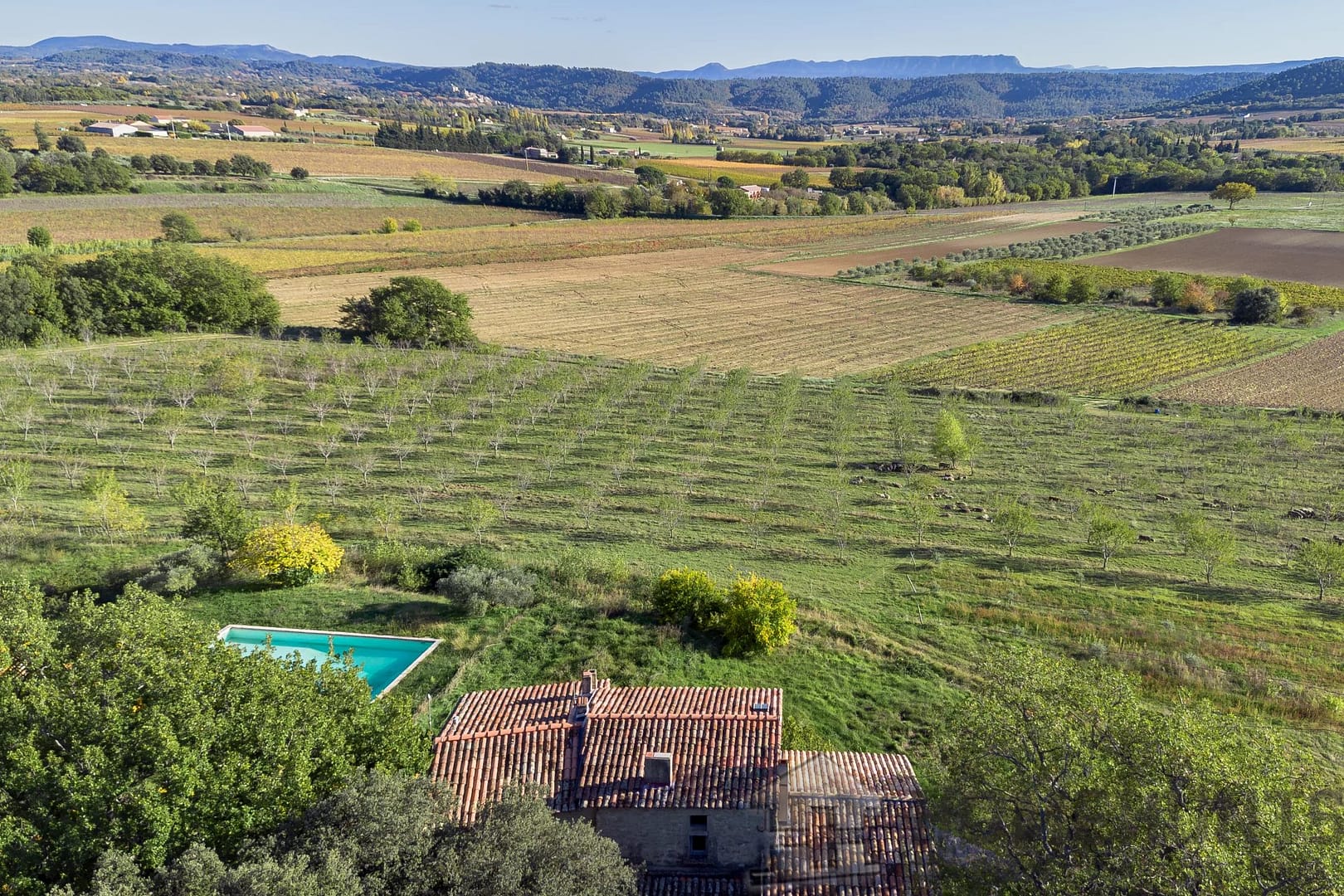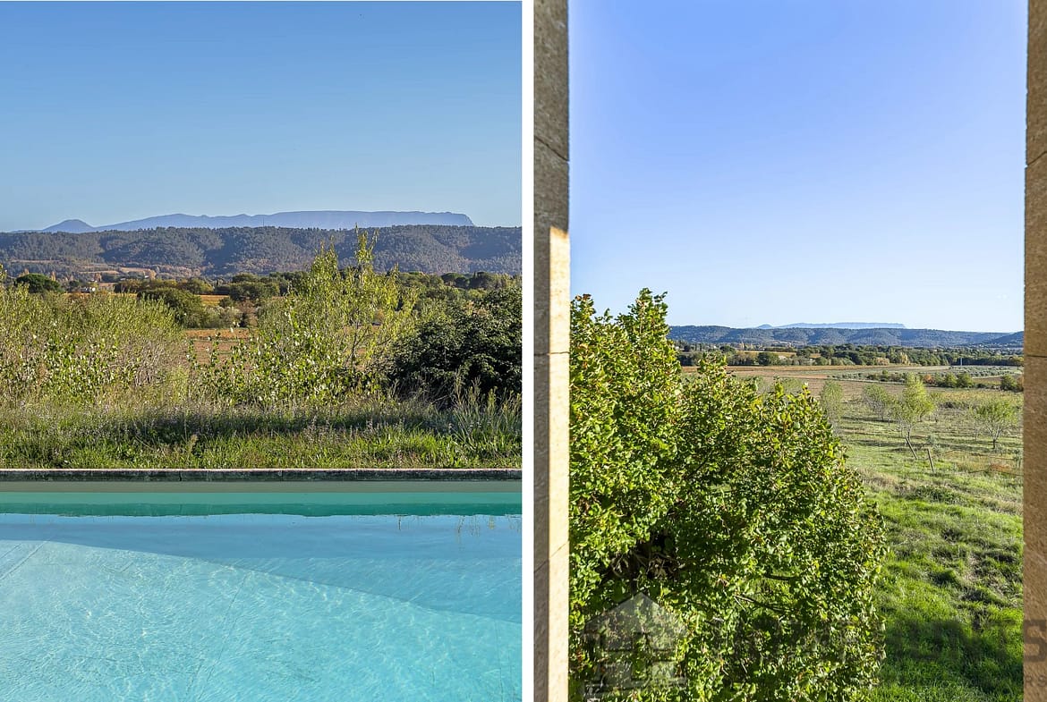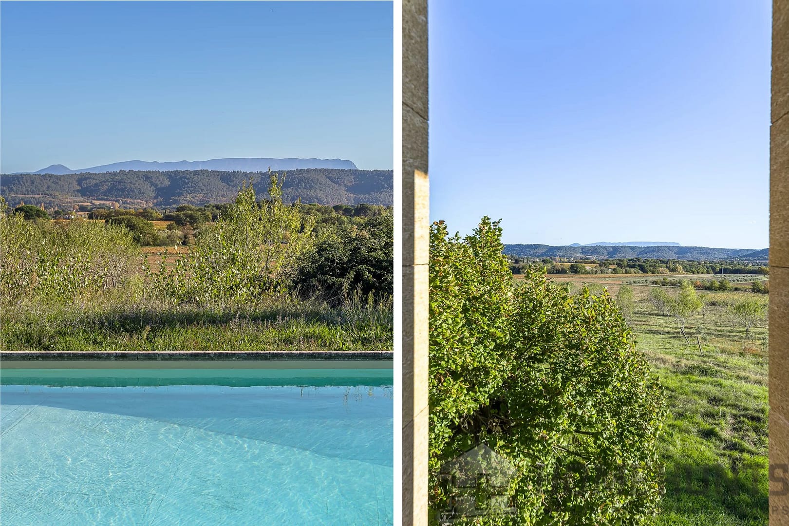 The two houses are located on a hillside, facing south and southeast, and the property boasts a commanding view over the valley, extending to the Sainte-Victoire mountain.
