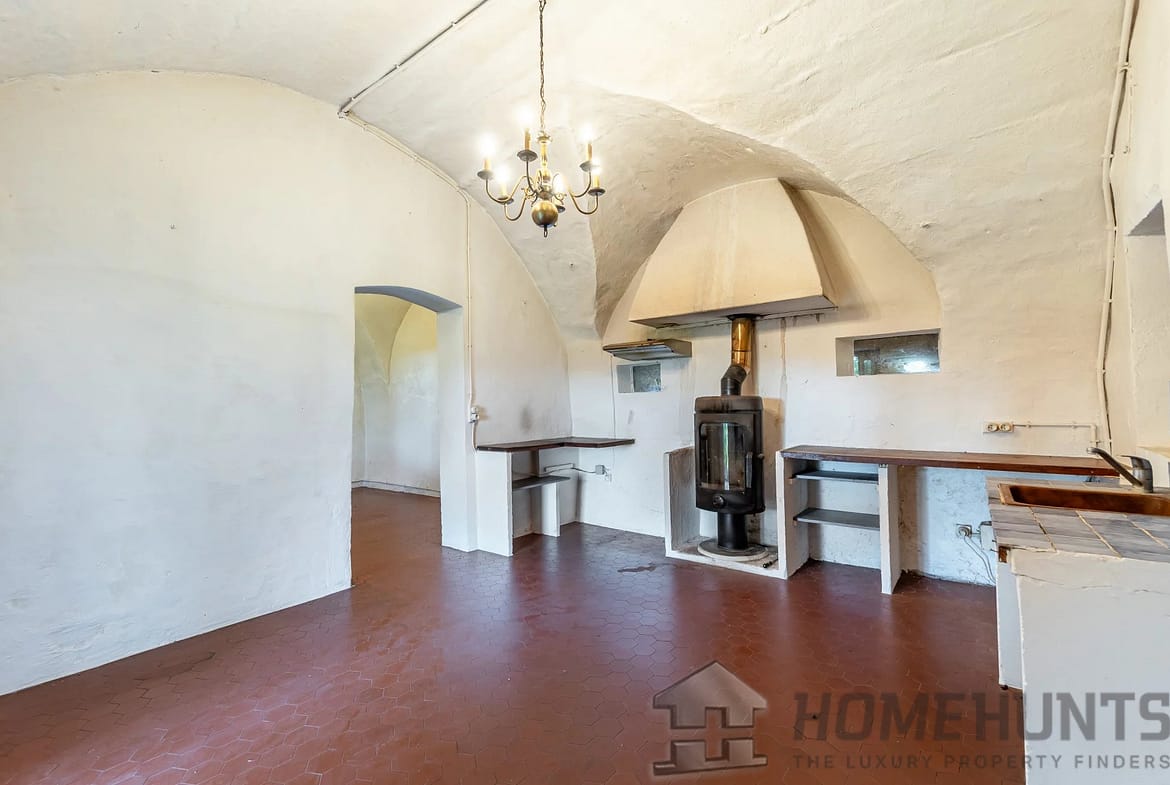 – First floor: east side, a large kitchen (with stairs to the second floor) opening onto an east- and south-facing terrace; in the center, a vaulted living room with a fireplace and a superb antique stone staircase; on the west side, a shed intended to extend the existing living room; on the north side, an entrance hall with a cloakroom and toilet.