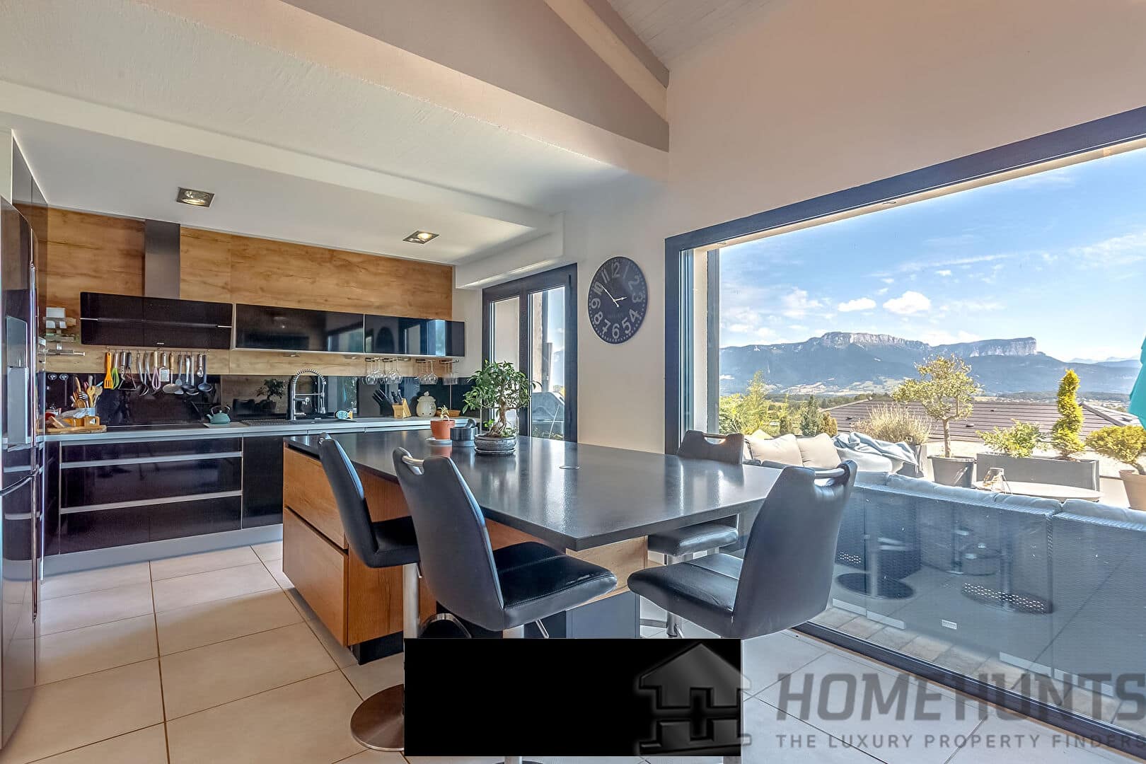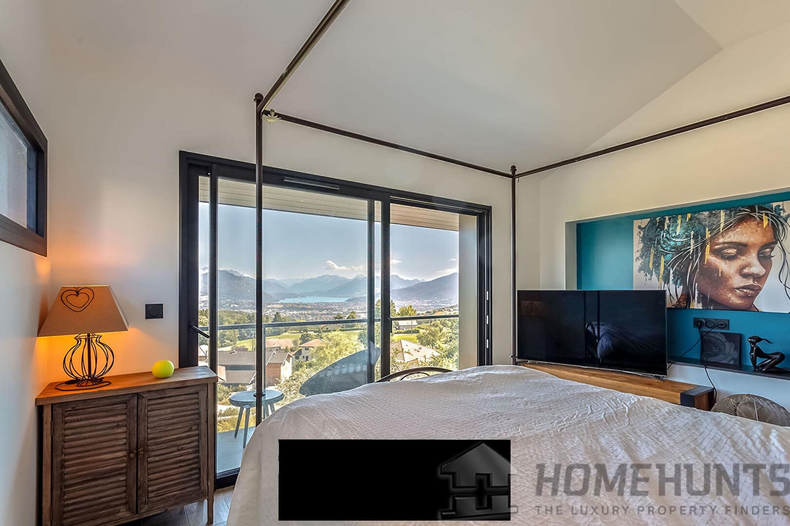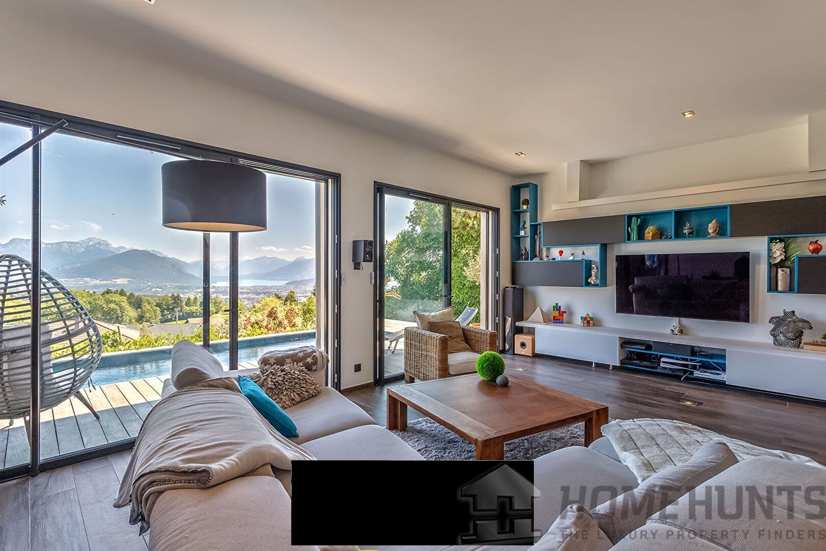 Located in the town of Cuvat, this beautiful architect-designed house of 420 m2 offers a breathtaking view of the mountain ranges and the lake.