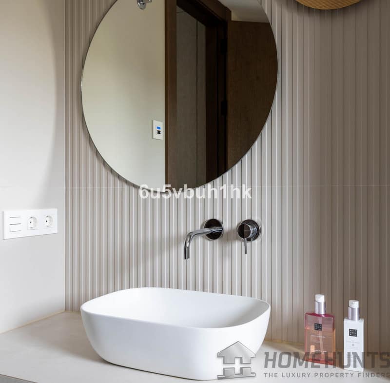 Inside, the architecture reveals a seamless interplay of light and space. Sunlight pours through expansive windows, accentuating lofty ceilings and framing sweeping views of the Mediterranean. Designer furnishings, chosen for their craftsmanship and timeless elegance, define each room with sophistication and comfort. Two bioethanol fireplaces – in the living room and master suite – introduce a soft, flickering glow, adding warmth and intimacy to the contemporary design.