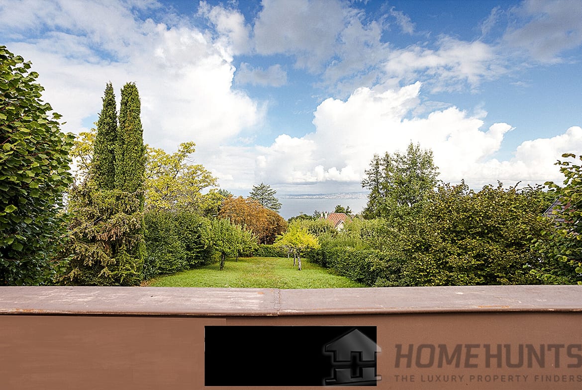 The upper floor accommodates three additional bedrooms, a bathroom and a large suspended terrace facing Lake Geneva, offering a clear view.