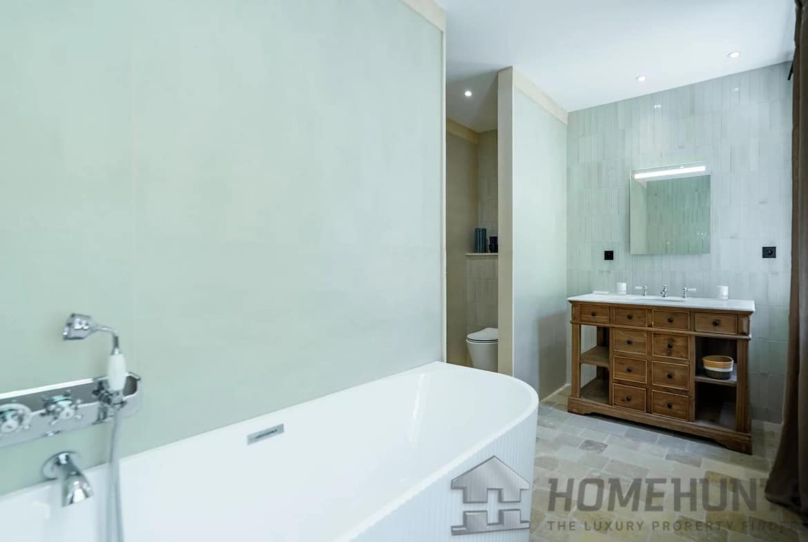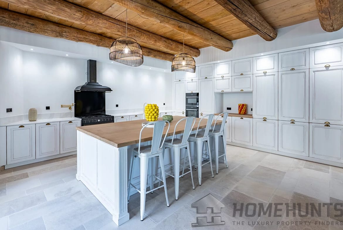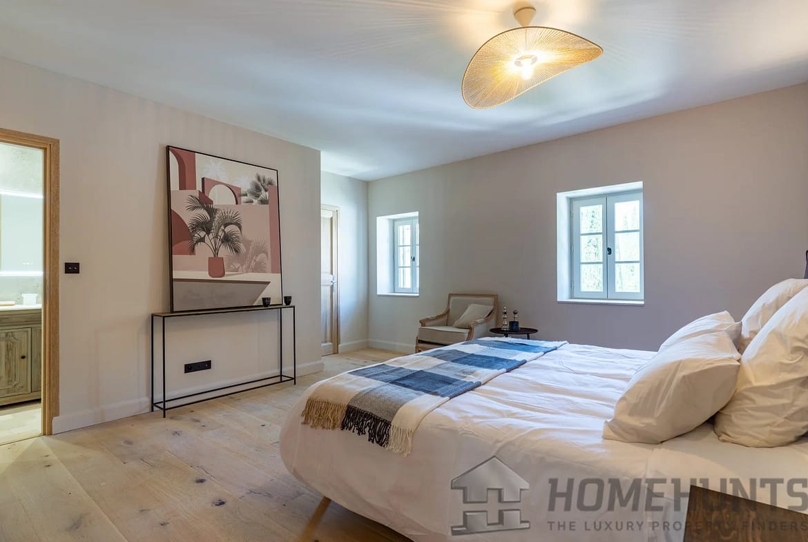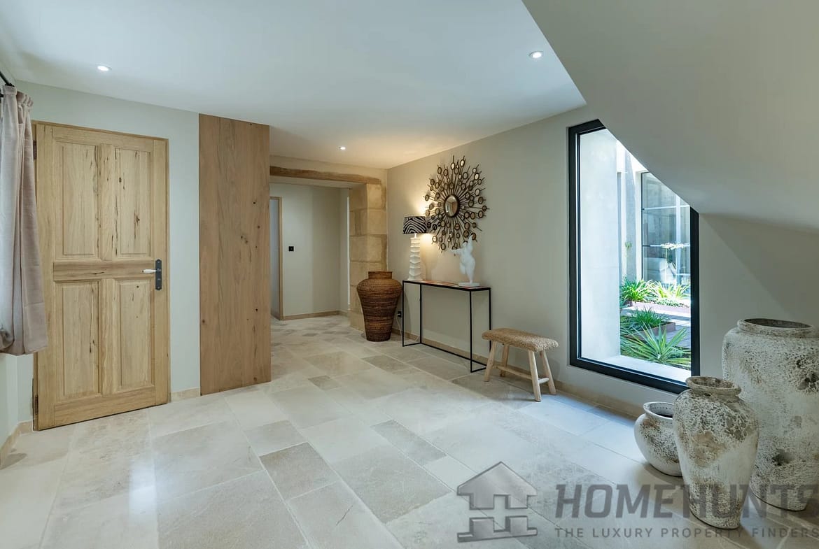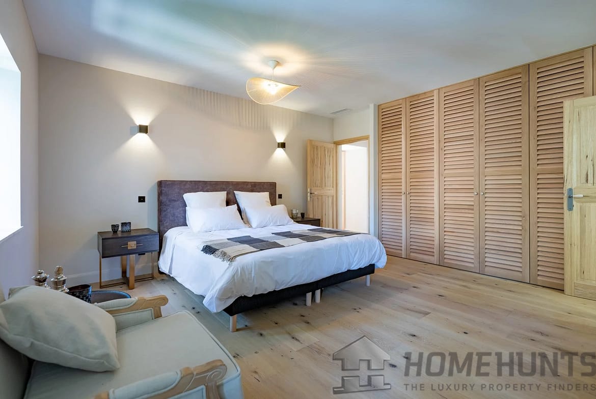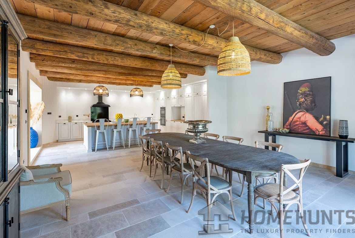 Spanning over 310 m2, the house opens onto a magnificent double-height living room with exposed beams, creating a grand yet inviting atmosphere. The spacious kitchen and dining area set the stage for convivial gatherings, while six en-suite bedrooms — including a ground-floor suite and an independent guest suite — offer privacy and comfort for family and friends.