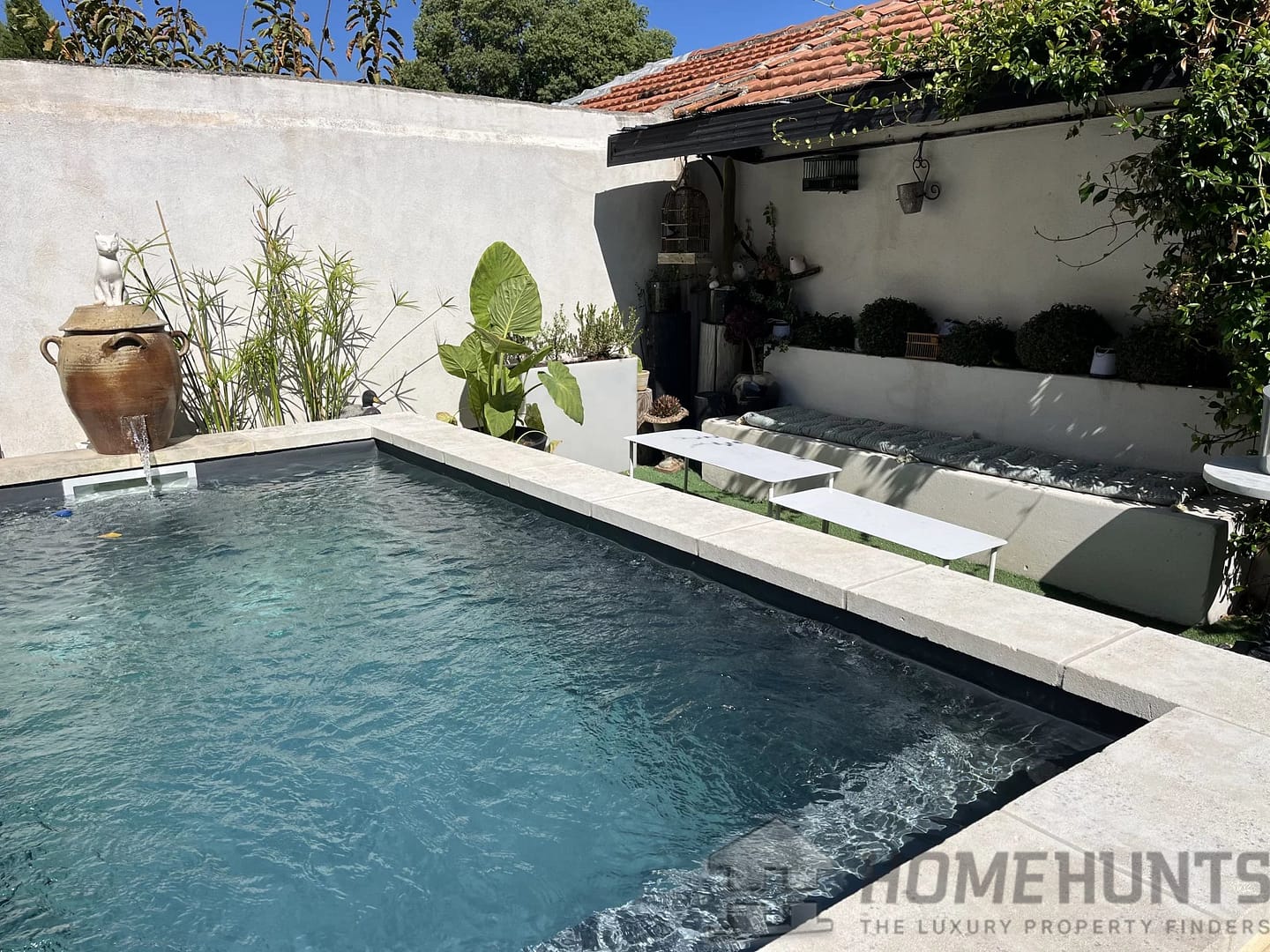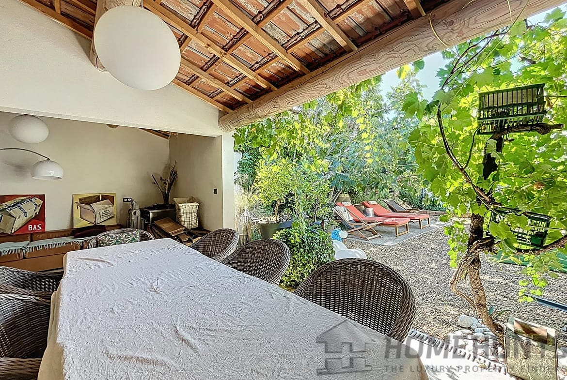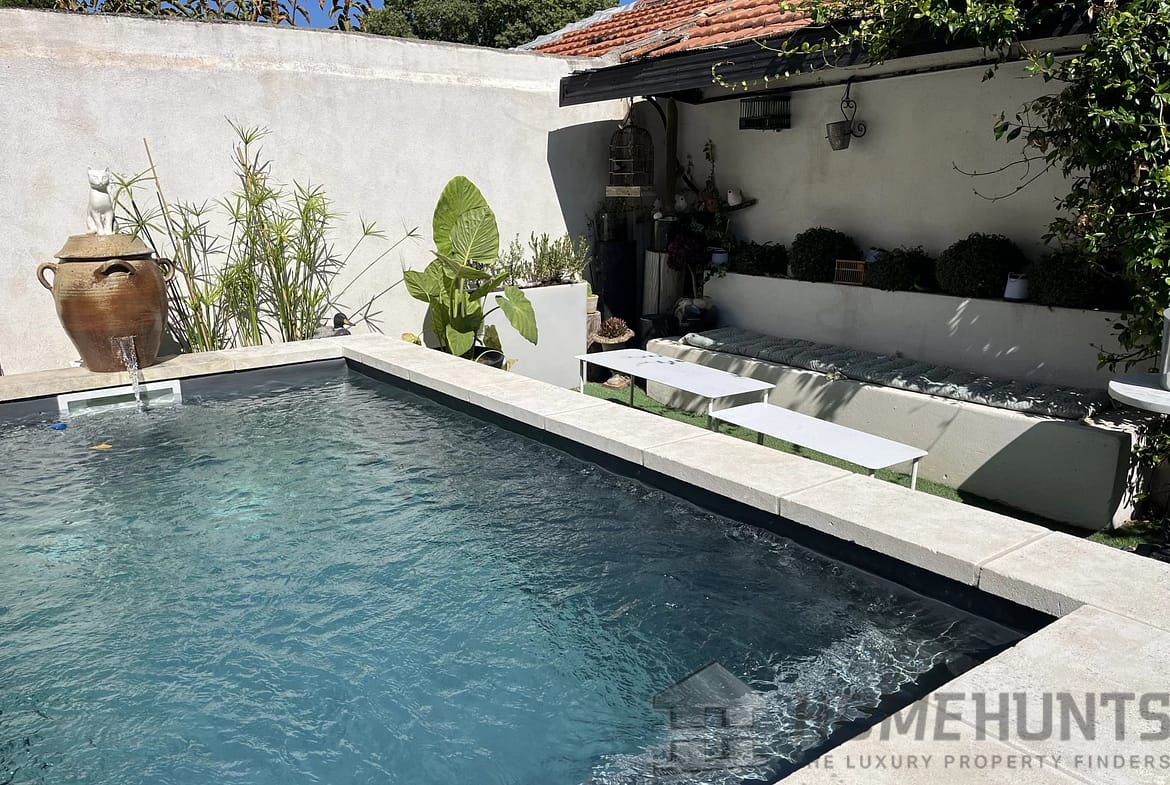 The enclosed 295 m2 garden is designed for relaxation and entertaining, featuring a swimming pool with shaded areas, a covered summer dining terrace, a sunbathing corner, and a storage cabanon.