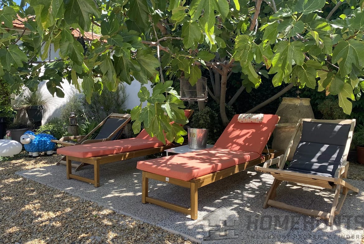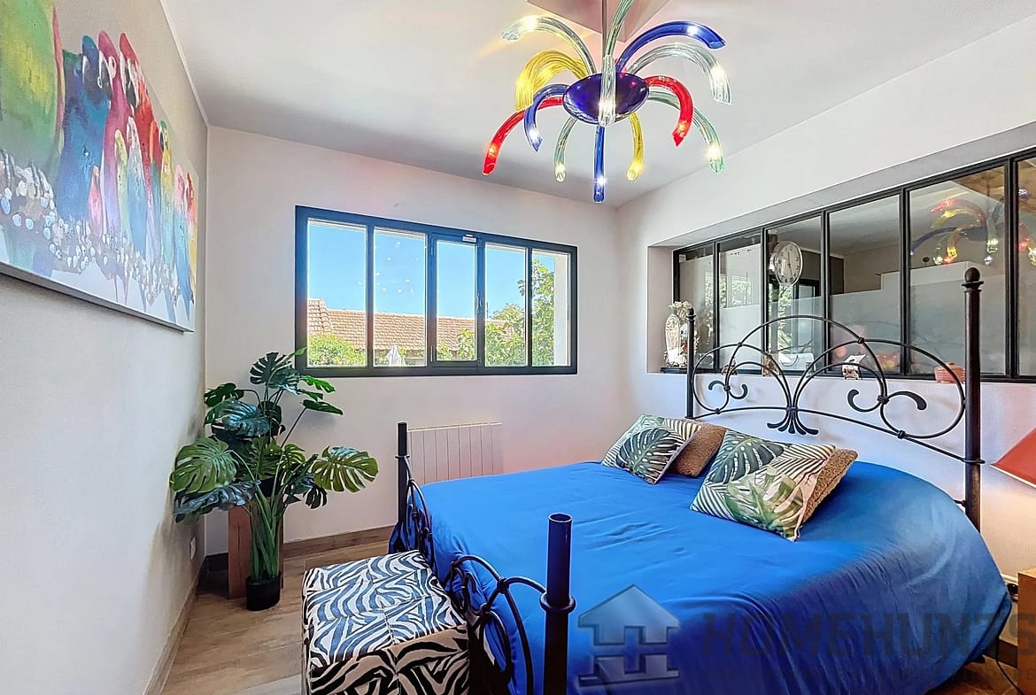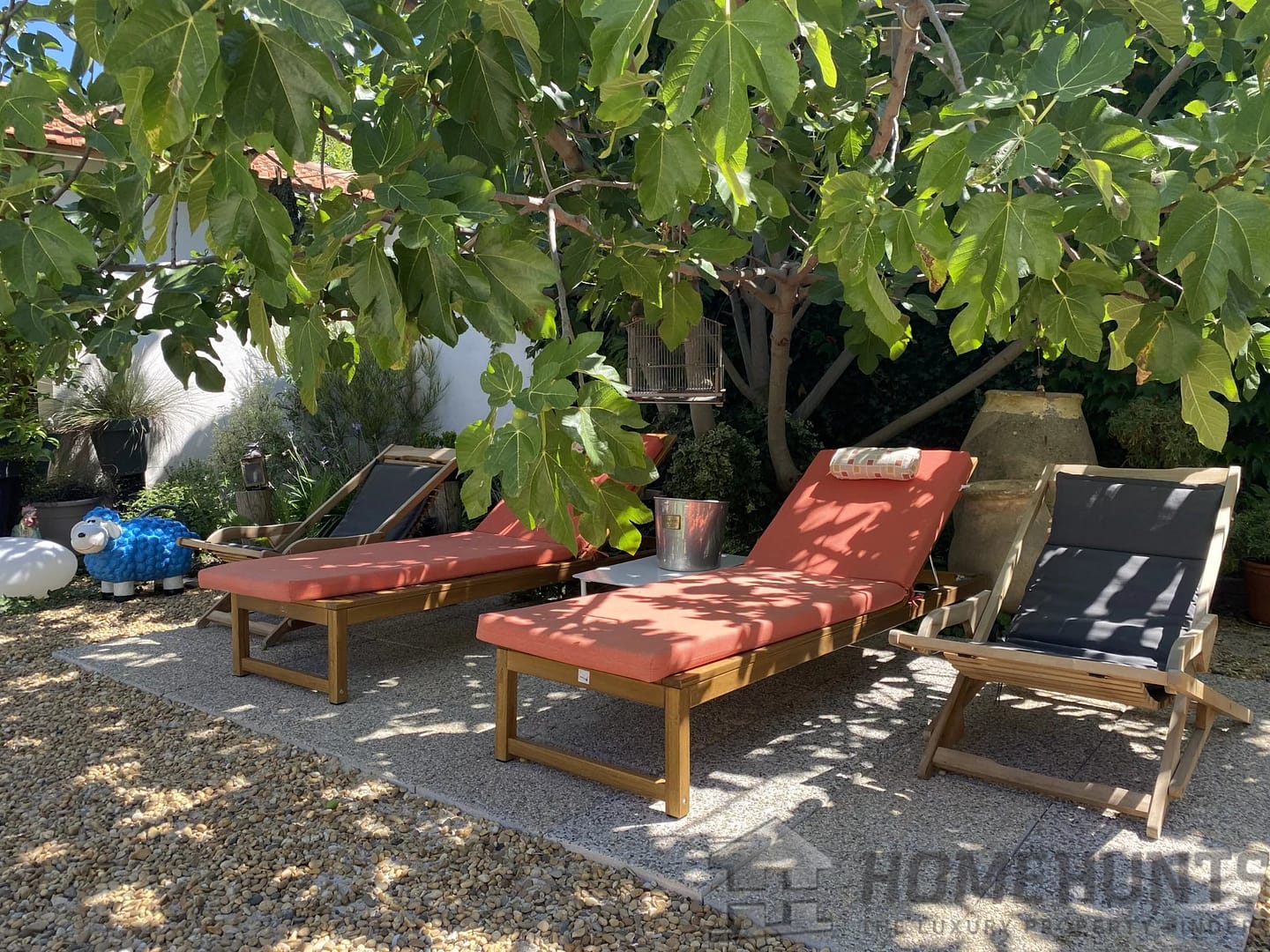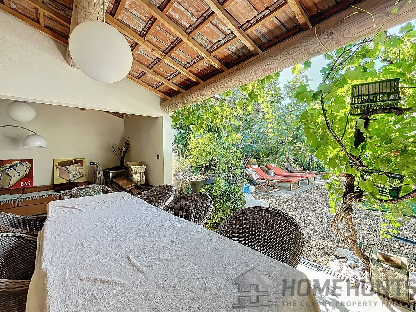 The enclosed 295 m2 garden is designed for relaxation and entertaining, featuring a swimming pool with shaded areas, a covered summer dining terrace, a sunbathing corner, and a storage cabanon.