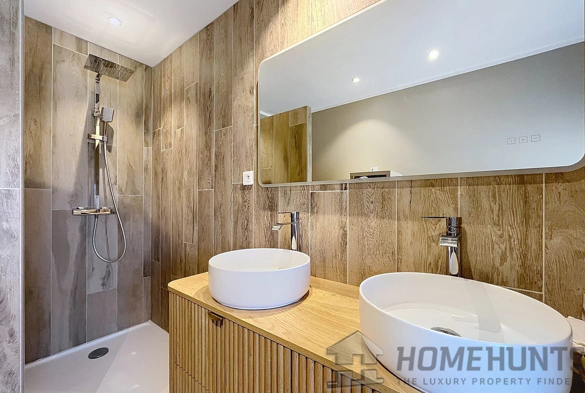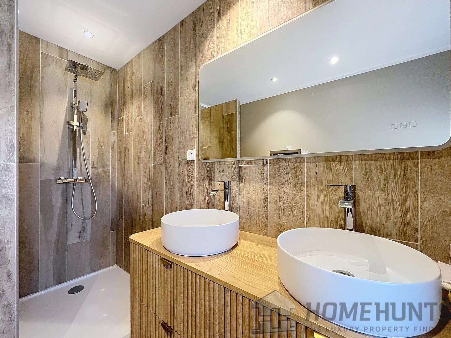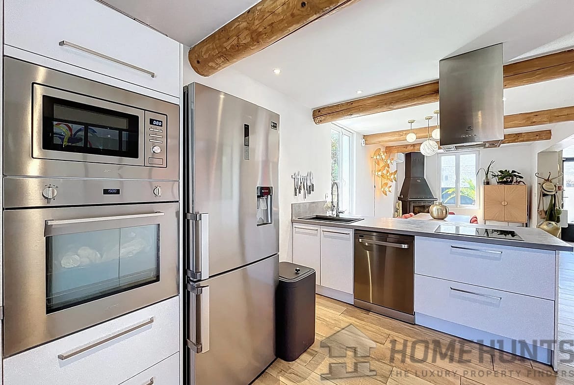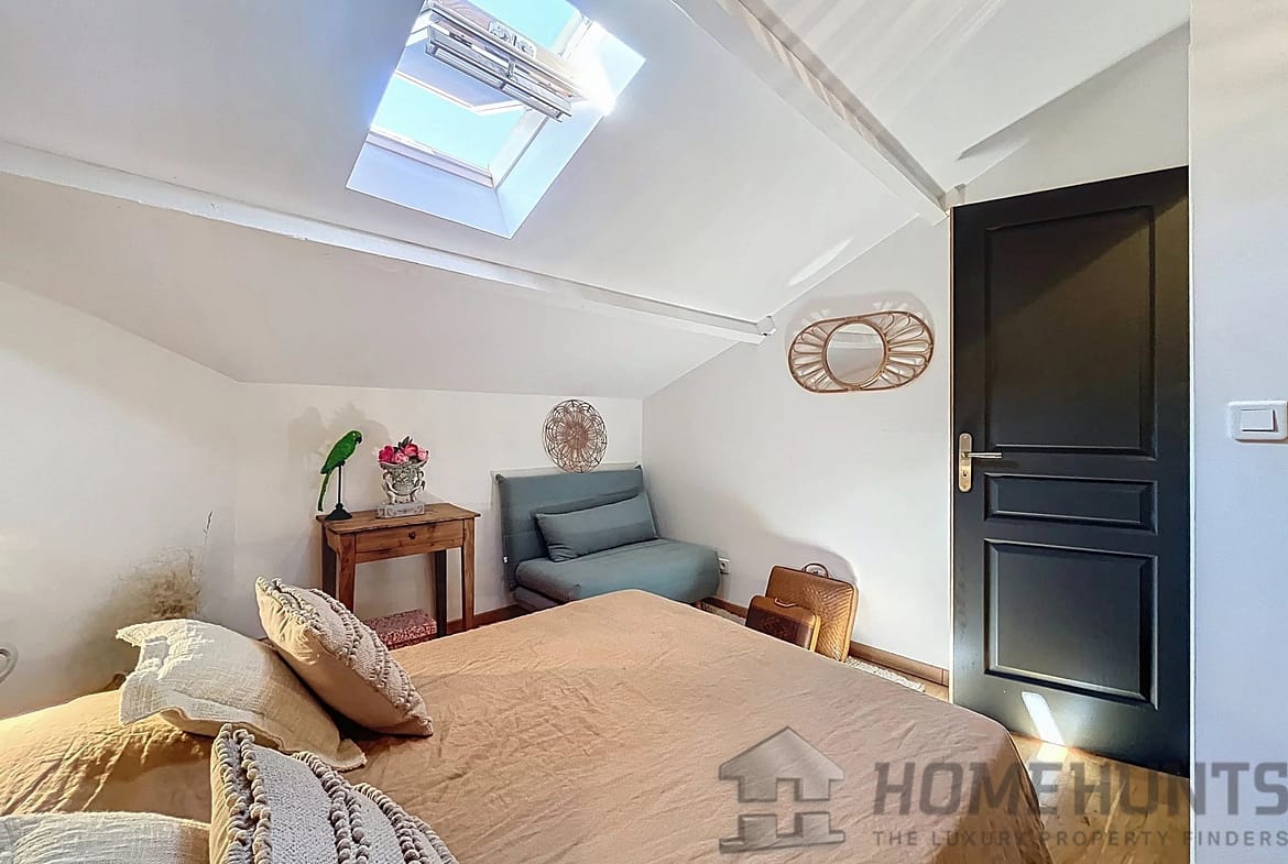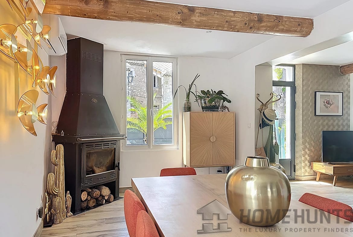 Inside, light-filled contemporary interiors blend clean lines with soft tones to create an elegant and soothing atmosphere. The living space includes a stylish lounge with fireplace insert, a modern fully equipped kitchen opening onto the garden, a ground-floor bedroom, and a shower room. Air-conditioning is fitted both in the living room and upstairs bedrooms for year-round comfort.