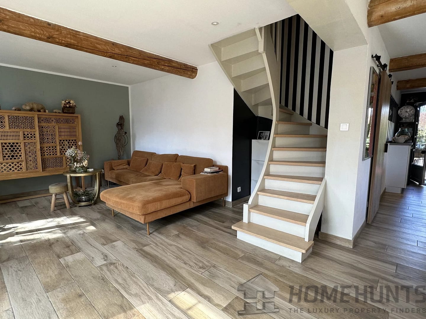 On the ground floor, a bright living room with fireplace opens onto a modern kitchen and dining area, designed for gathering and sharing. A ground-floor suite with its own bathroom completes this level.