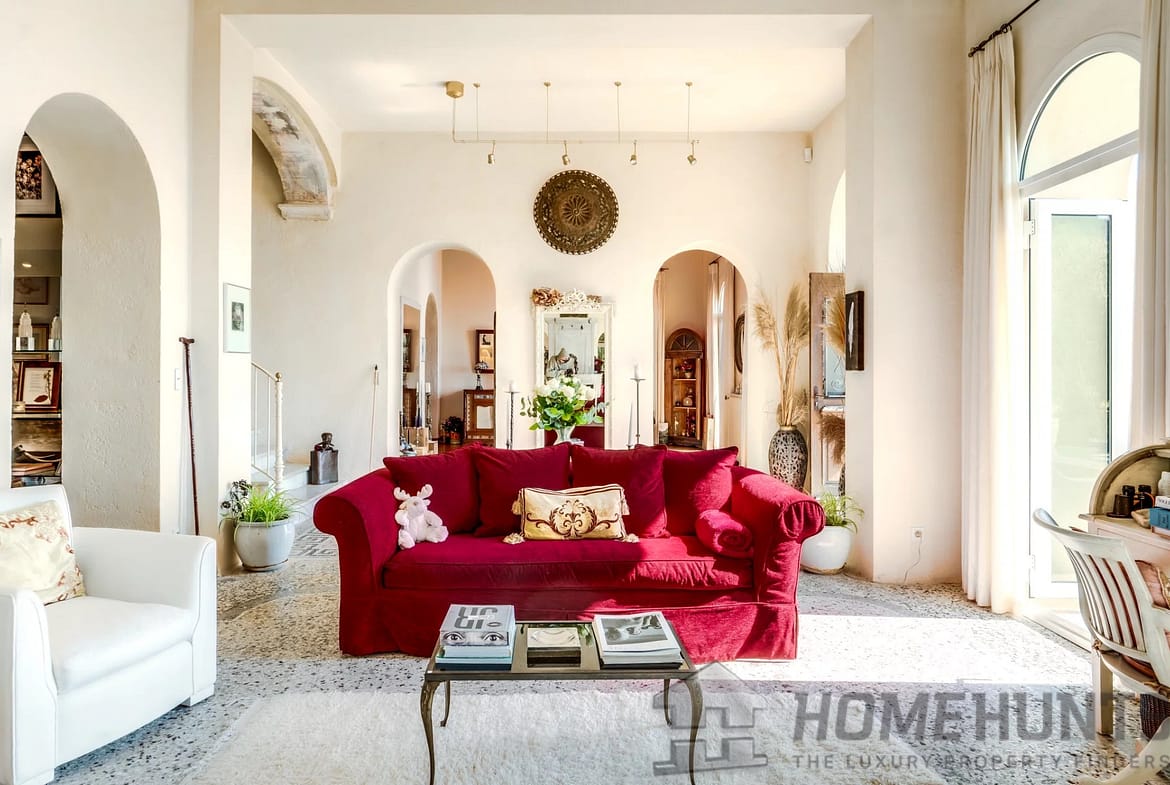 The main villa spans over 400m2, while the guest villa offers 150m2. Step inside, and you’re immediately drawn to its charm: a warm and inviting living room with a grand old fireplace, exposed wooden beams, and Venetian mosaic tiles. Every detail tells a story.