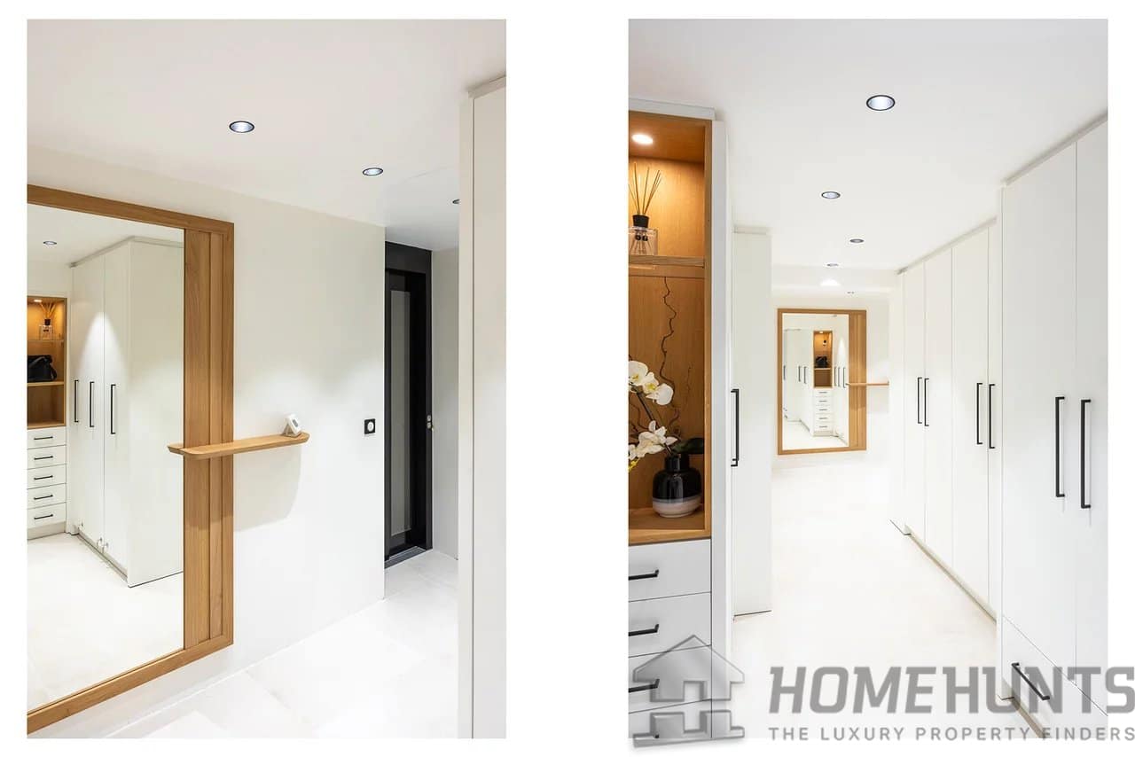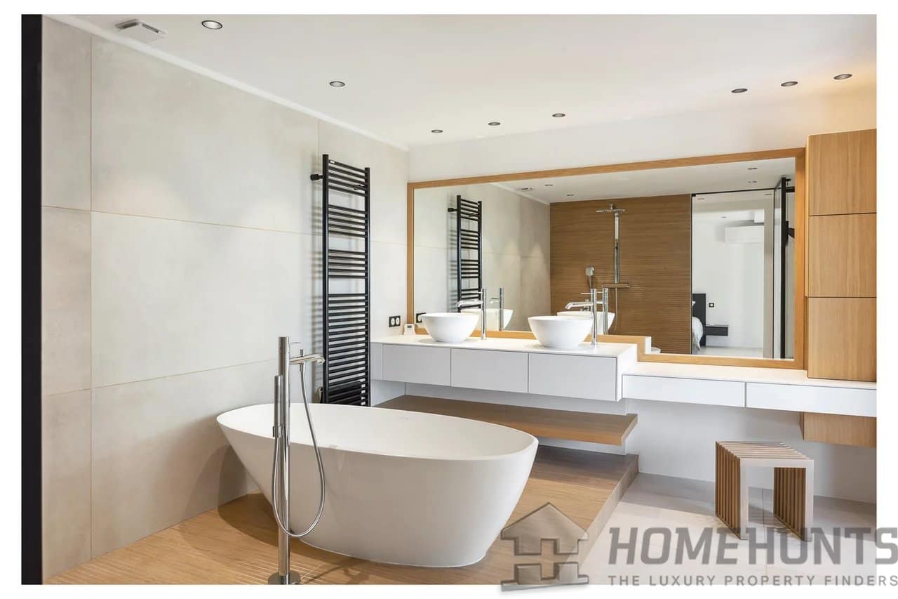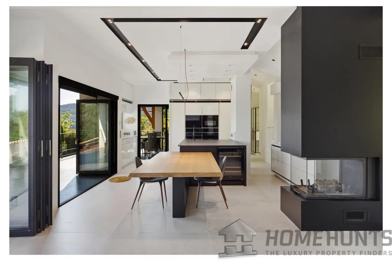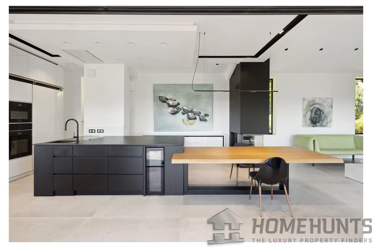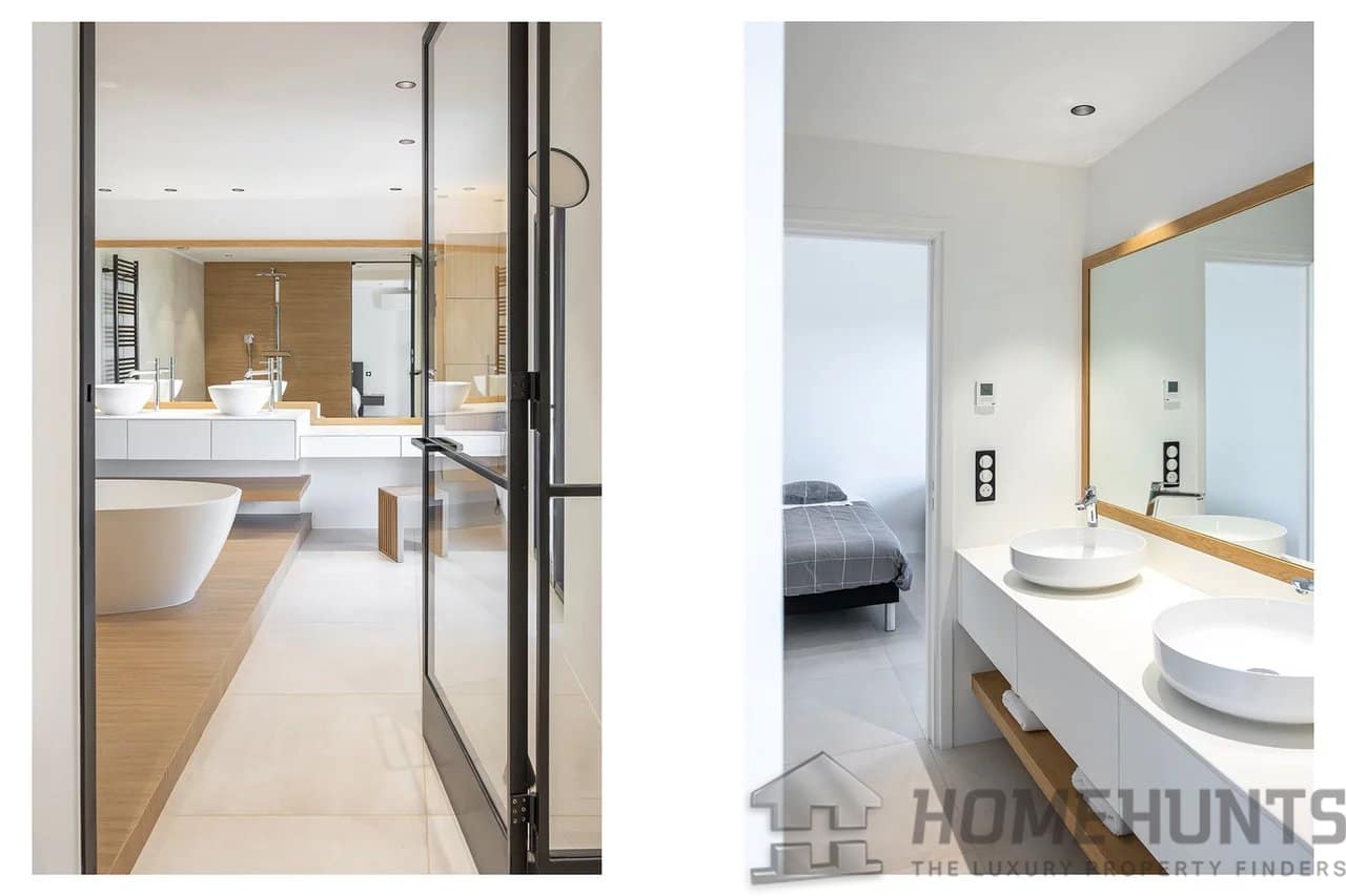 On the second floor, a double living room with large bay windows opens onto a 42m2 patio and a summer kitchen. The fully equipped American kitchen has ample storage. Also at this level are a study with an adjoining WC and a laundry room.