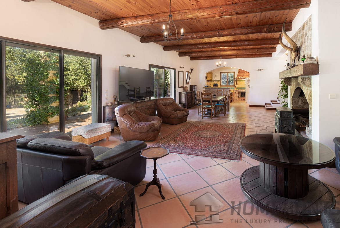 The property comprises – entrance hall and guest WC, leading onto an open plan living room / dining room of 60m2 with large fireplace, communicating with an open plan kitchen of 25m2. The living area leads out to two covered terraces with seating area and built in barbecue on covered terrace on western side.