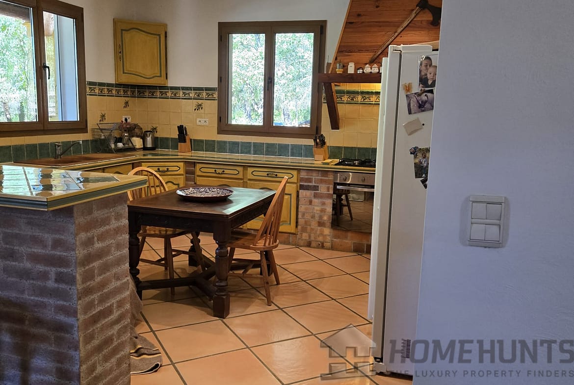 The main house (150m2) comprises: porch, entrance hall, separate toilet, large living room with fireplace, leading to a covered terrace, fitted American kitchen + laundry room, utility room.