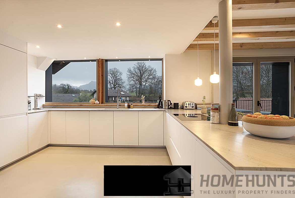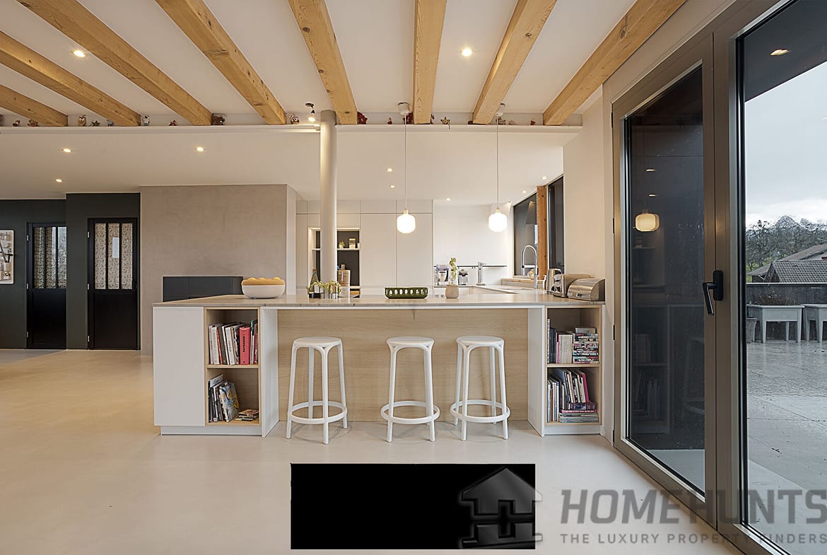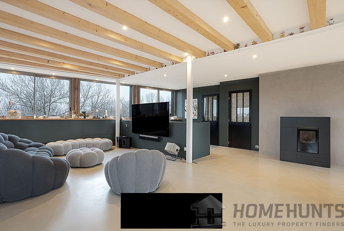 The top floor, the real centrepiece of this home, reveals a spectacular living space of around 100 m2, including a vast, beautifully-crafted kitchen. The waxed concrete floor and large picture windows create a warm, modern atmosphere bathed in natural light. An open-plan mezzanine adds an extra dimension to this architectural showcase. A natural extension of this space, a south-facing terrace invites you to savour special moments overlooking the beauty of the surrounding countryside.