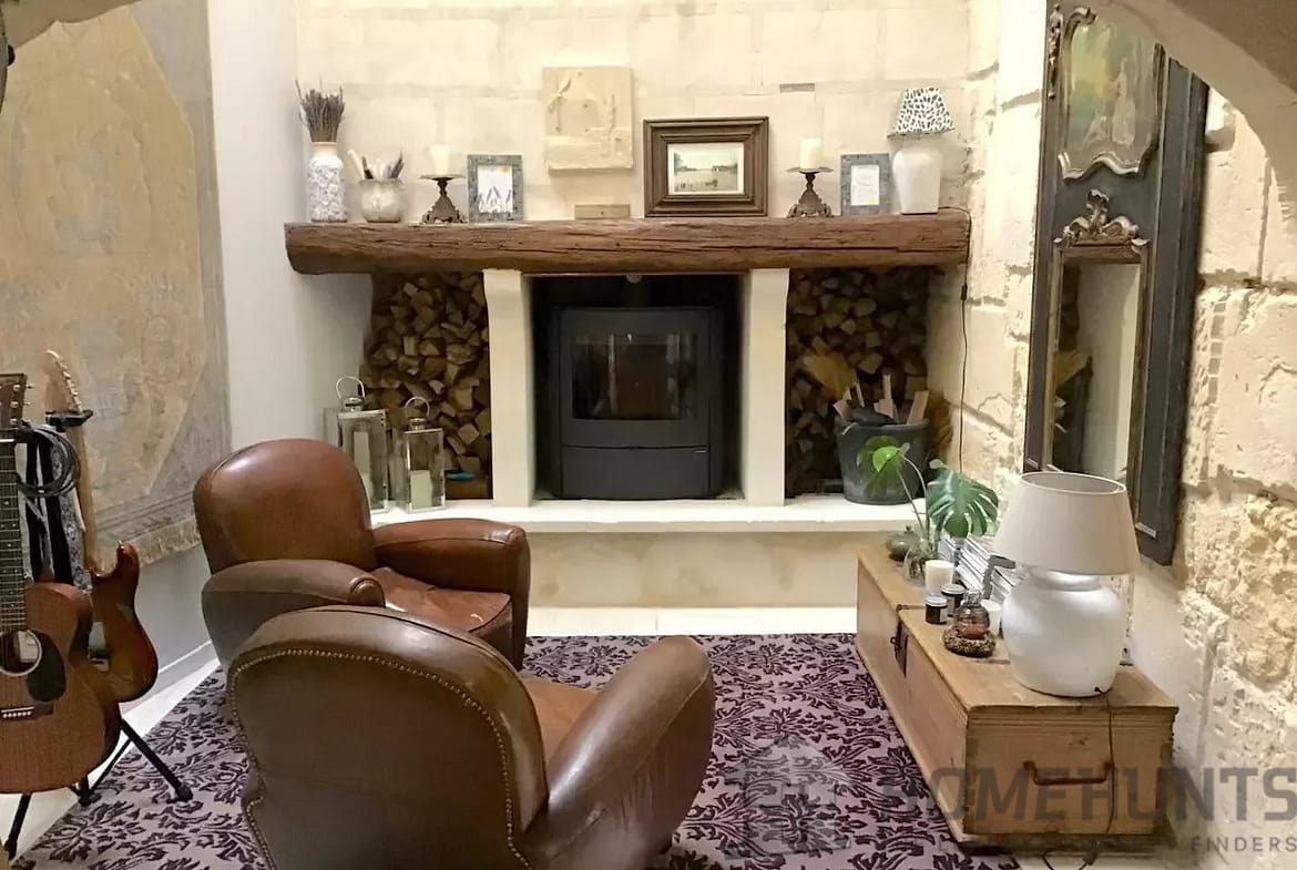 – Spacious living room with high ceilings & fireplace stove