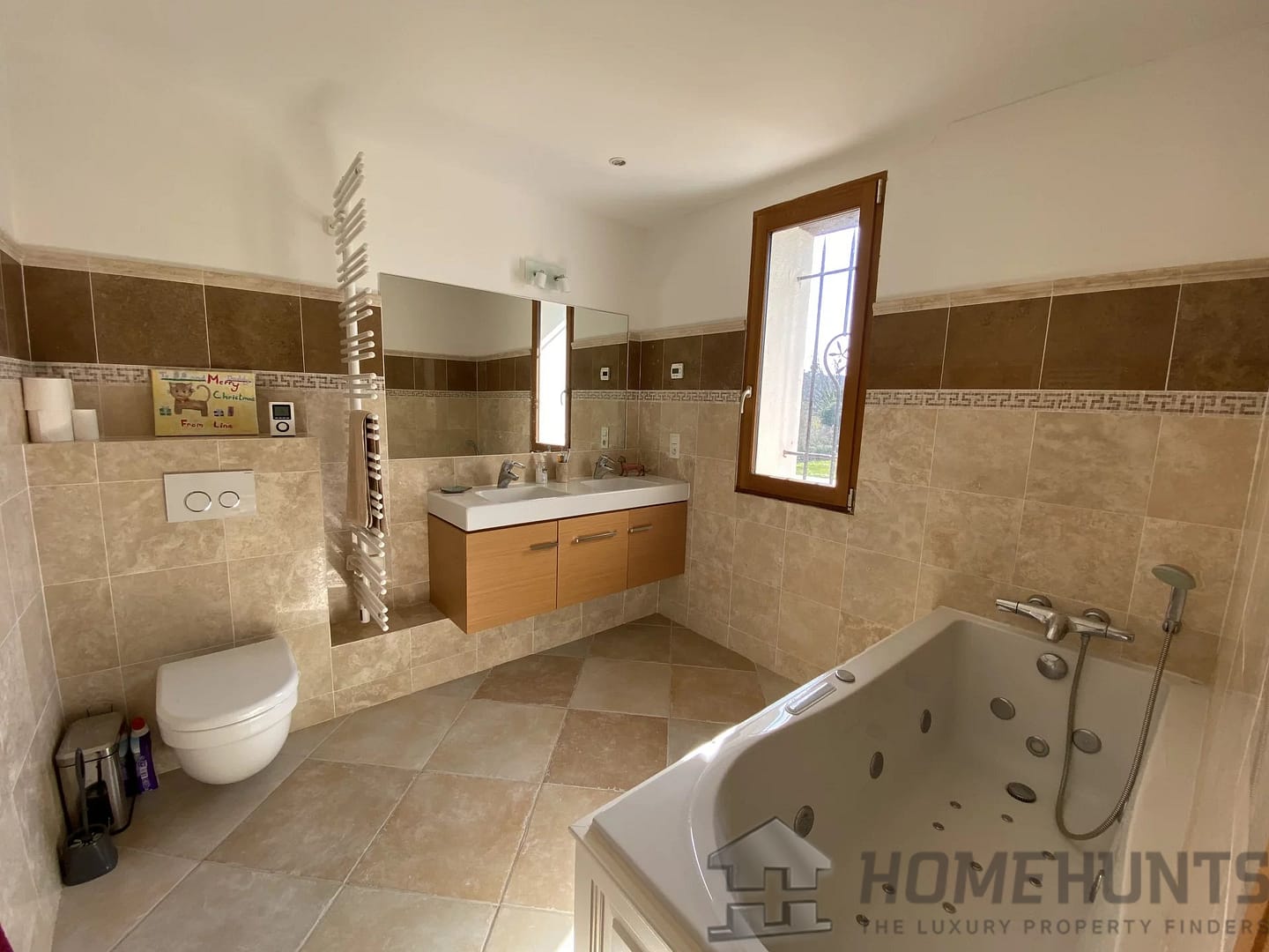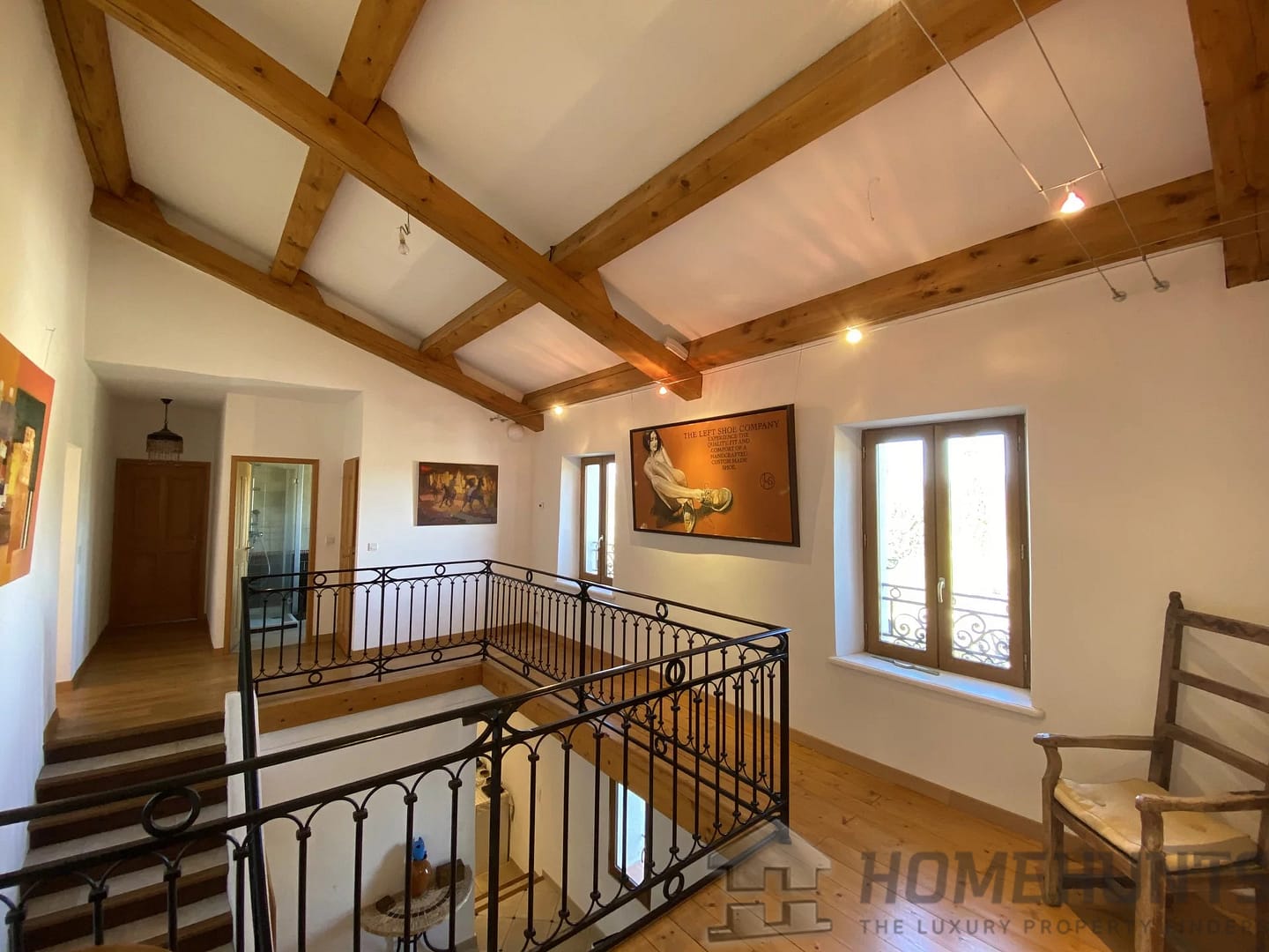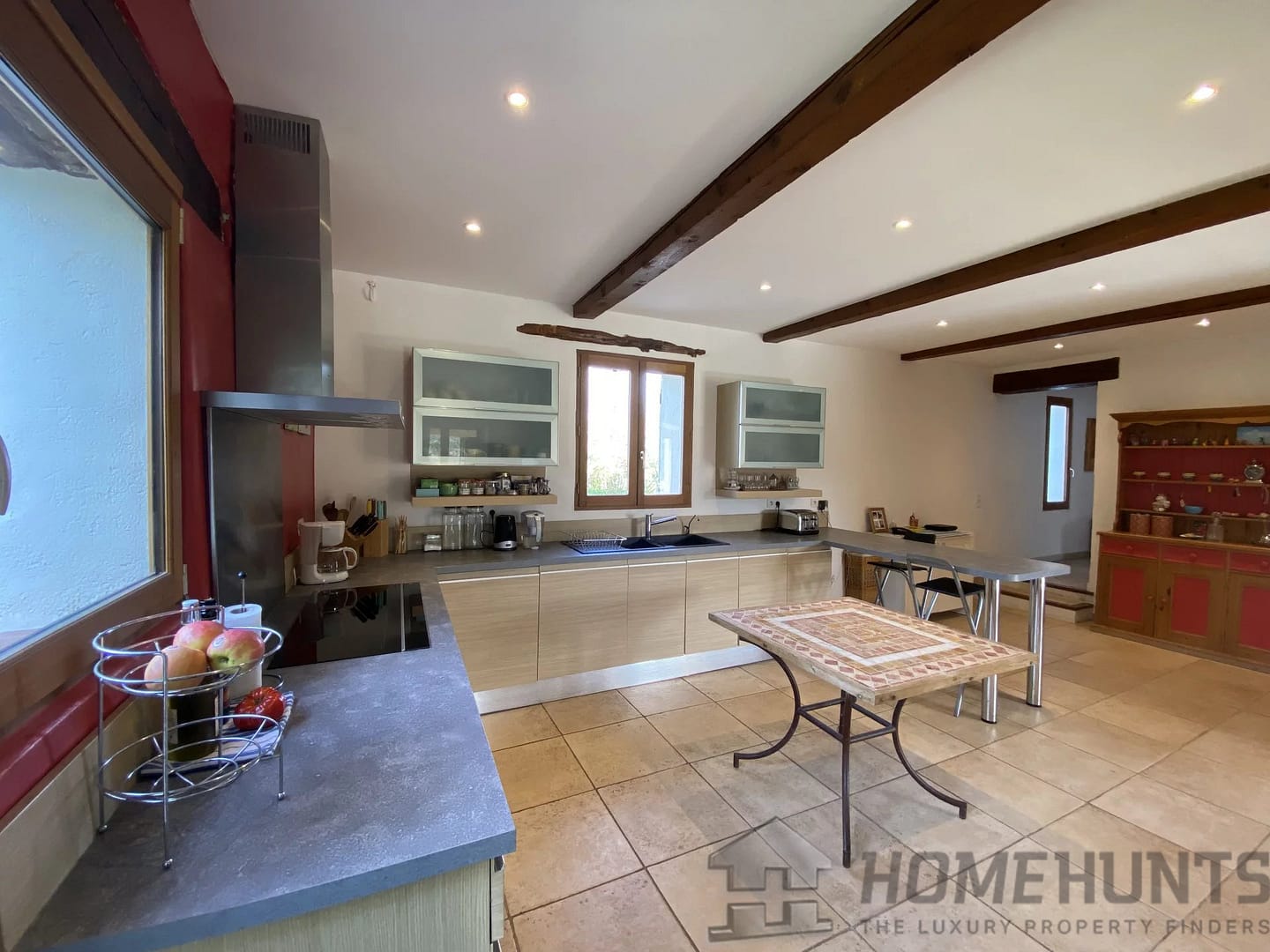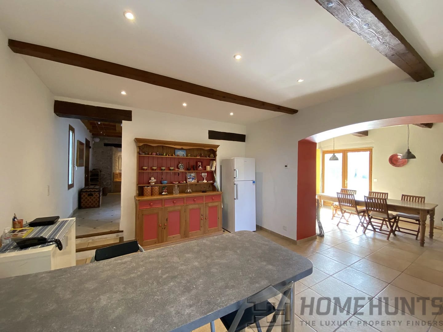 Large open hall atrium going up to the roof with magnificent wood beams and surrounding internal balcony. drawing room with Louis XV fireplace. dining room with lit alcove and wood burner. living TV room. large modern kitchen with induction plaque and American style Fridge/freezer. 5 bedrooms with 3 bath/shower rooms. including a principal bedroom with ensuite bathroom.