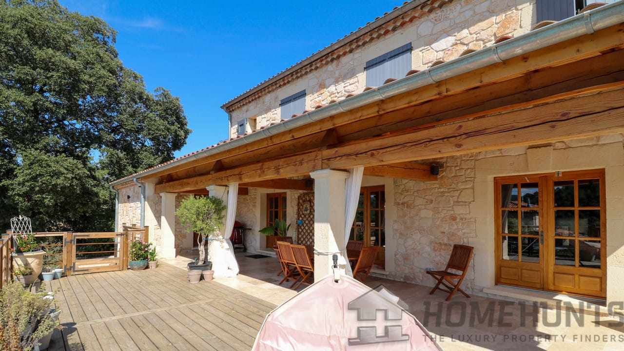 A31903RSI30 – Unique property with 2 independent houses, garage and swimming pool, built in 2014 in traditional style combined with charm and elegance with modern comfort is situated in a rural but not isolated location, only a few minutes from the popular town Anduze with restaurants, cafés, a lively weekly Thursday market, and a very popular antique/flea market every Sunday, 8 km from bigger town Alès with all amenities. Connections to airports and TGV from Nîmes (55 km) or Montpellier (70 km).