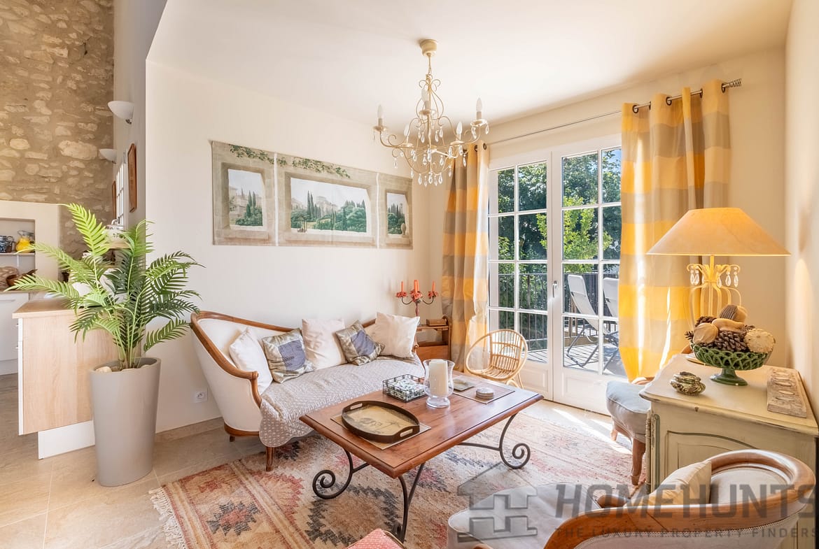 – A warm living room with exposed beams and Provencal ceiling