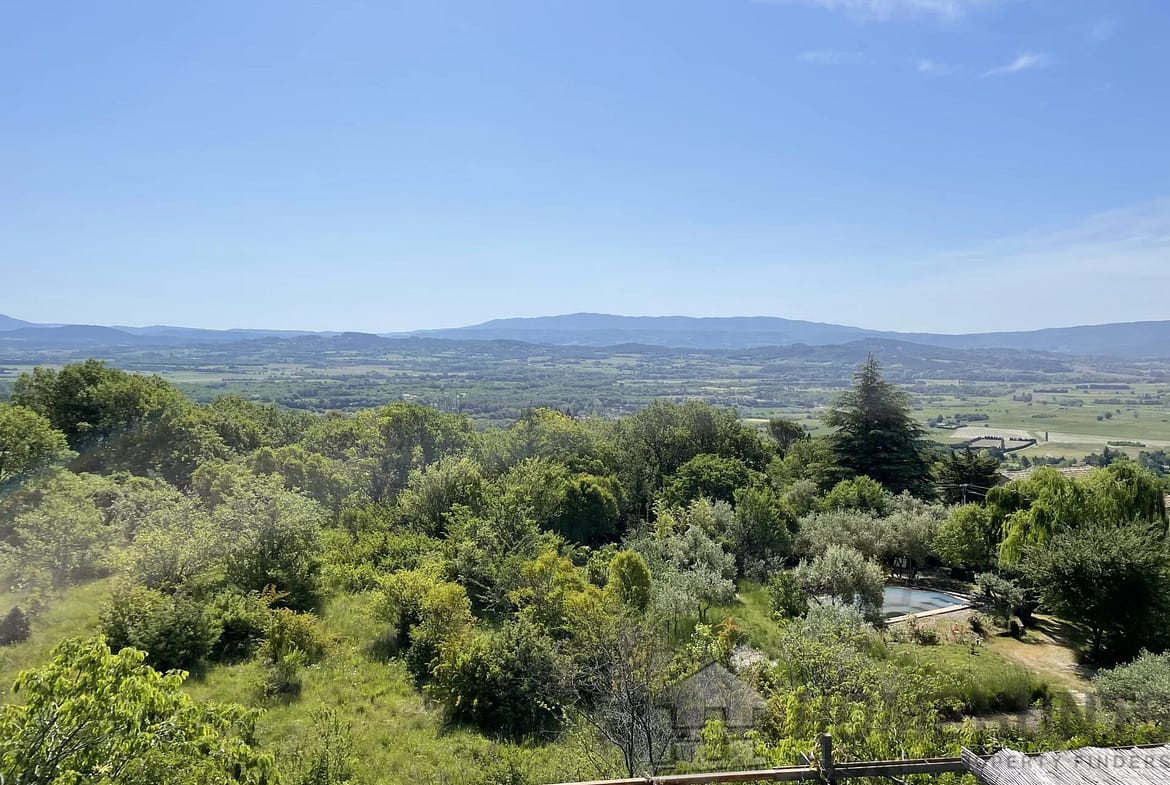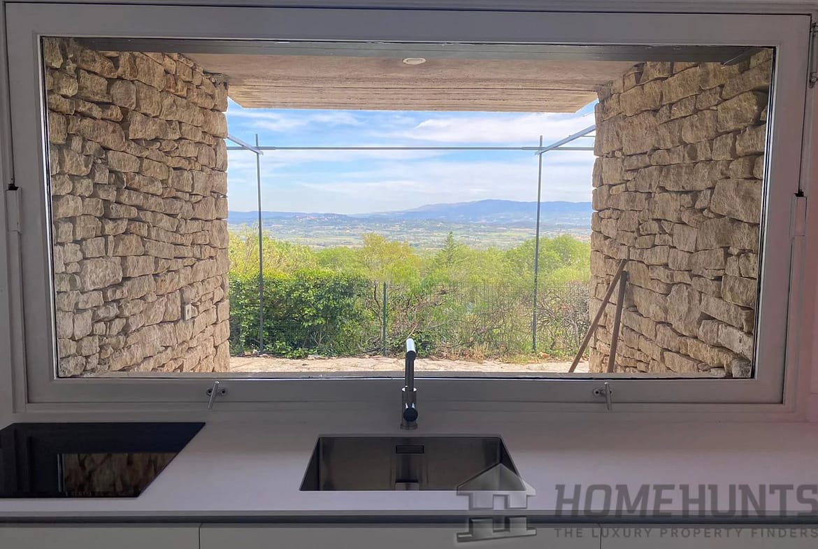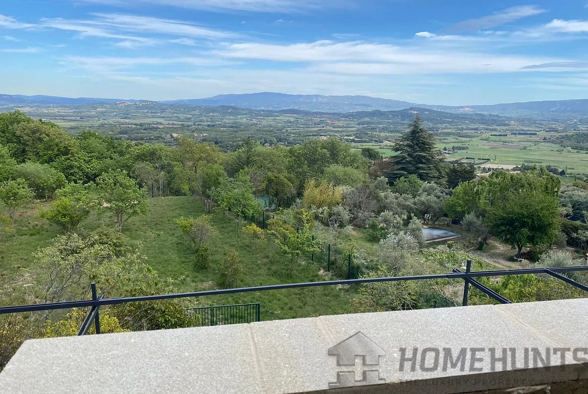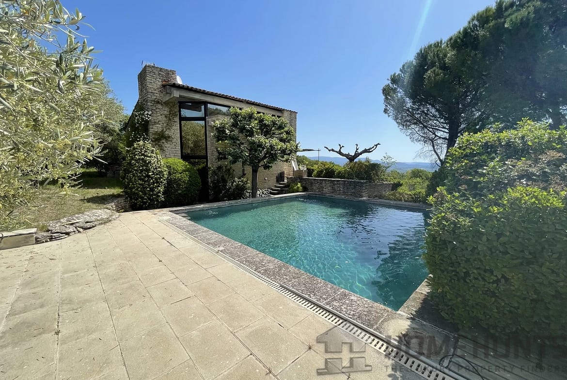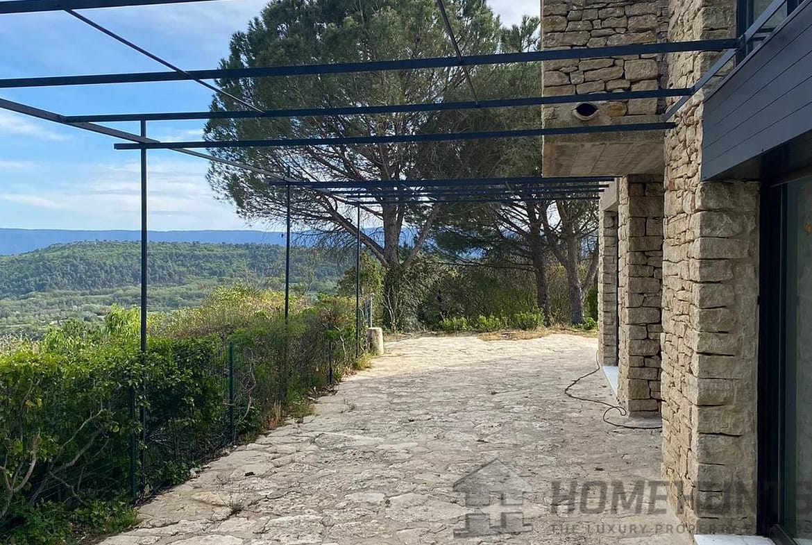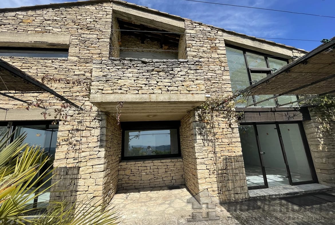 This contemporary house on a mezzanine level offers exceptional views of Gordes, the valley, and neighboring villages from its privileged location on a rocky outcrop.