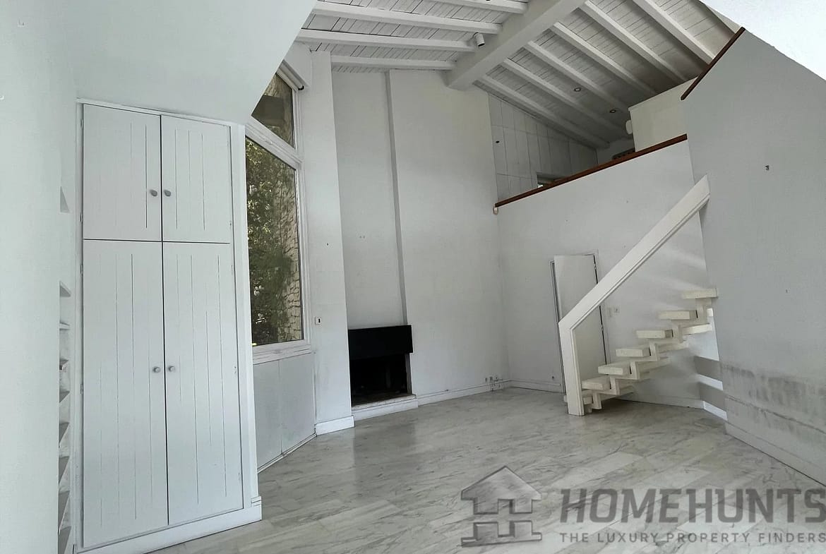 Built in 1980, this south- and east-facing house offers 170 square meters of living space on a landscaped plot of 2,341 square meters. It has a spacious entrance leading to a large hexagonal-shaped living room, a kitchen with panoramic views, a second living room, and a dining room. The mezzanine level includes an open bedroom, a bathroom with toilet, and a second bedroom. The garden level consists of a third bedroom with an ensuite bathroom and a large cave dug into the rock.