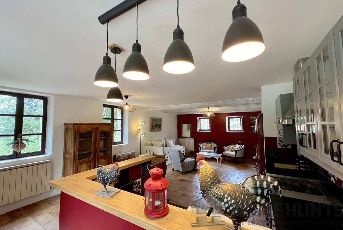* Ground floor: a large bright living room with fireplace (insert), a fully equipped kitchen, an office, a bedroom with cupboards, an en-suite bathroom (sink, “Japanese” bathtub and shower) and a toilet with wash hands.