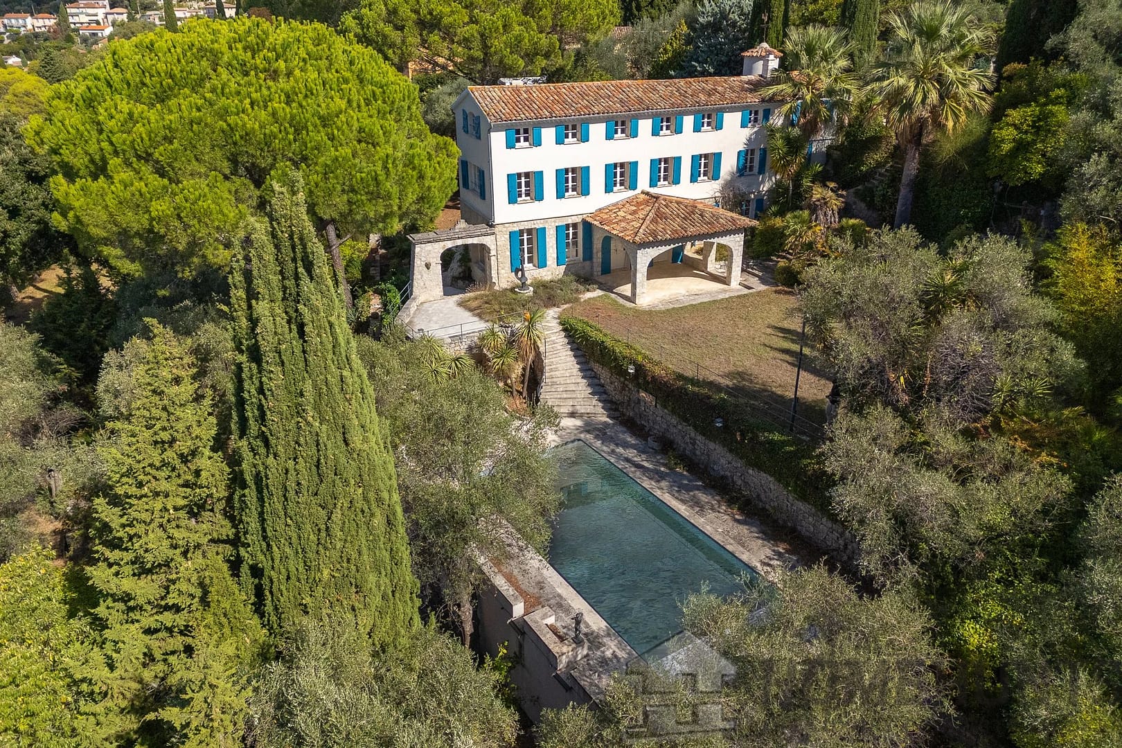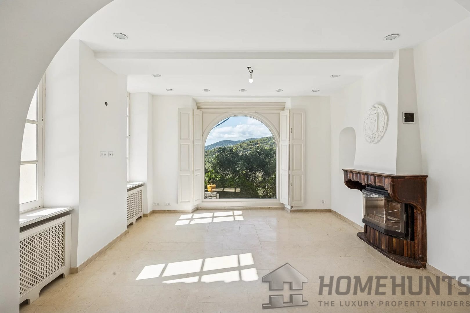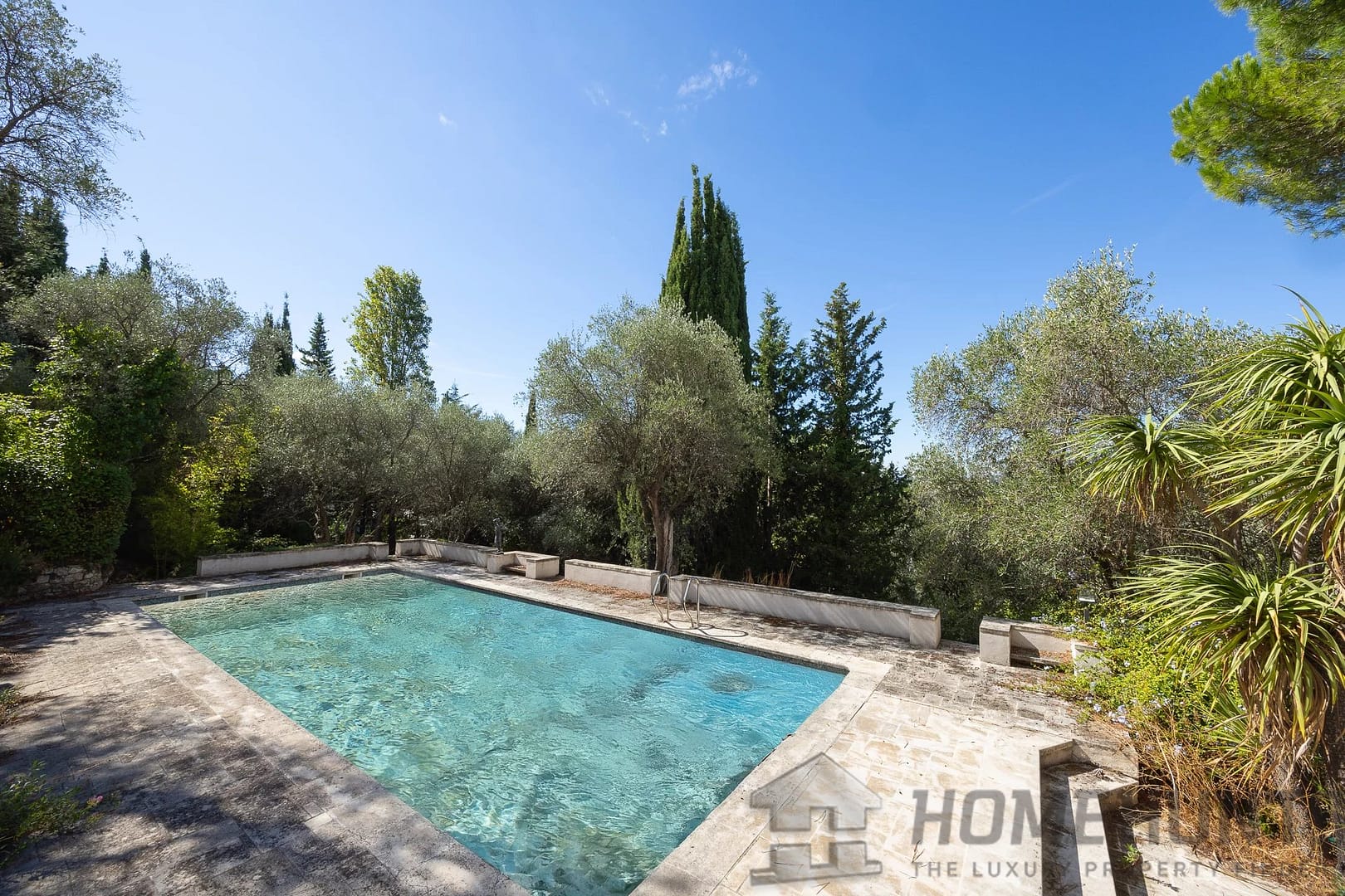 The landscaped grounds are adorned with sculptures by renowned artists and Mediterranean plants, offering a serene setting with a sauna overlooking the lush valley, a large fully renovated and heated swimming pool, and several parking spaces, including four covered ones.