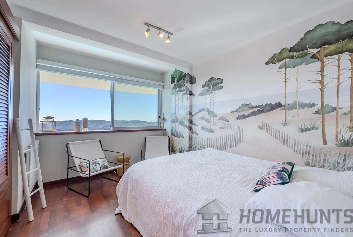 The main level offers an entrance hall, a brand-new open-plan kitchen, a dining room opening through wide bay windows onto a superb terrace with panoramic views extending to the Bay of Mandelieu, a bright living room with a contemporary fireplace, and a TV lounge.