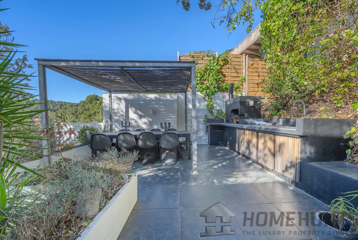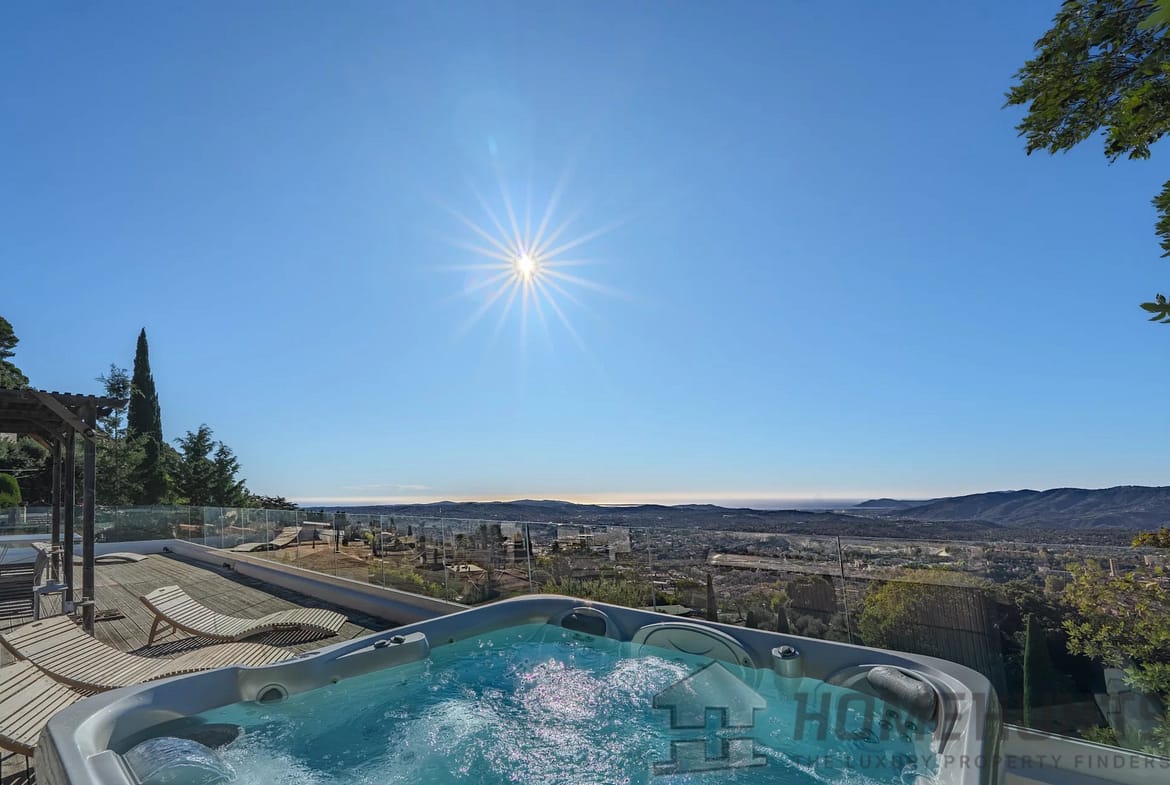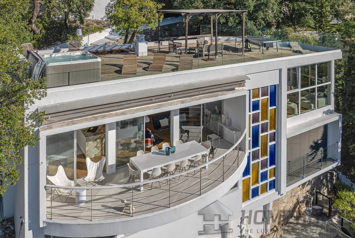 In a dominant position, enjoying full southern exposure and breathtaking views all the way to the sea, this character villa charms with its architecture inspired by 1960s Californian homes.