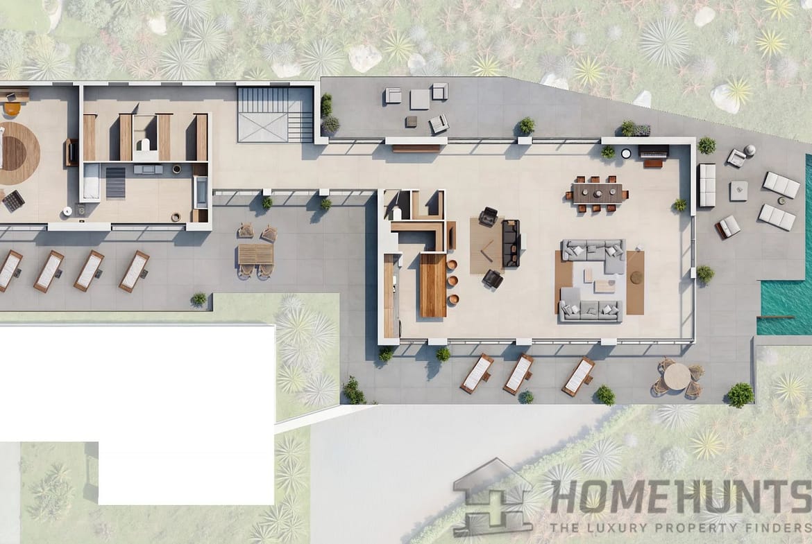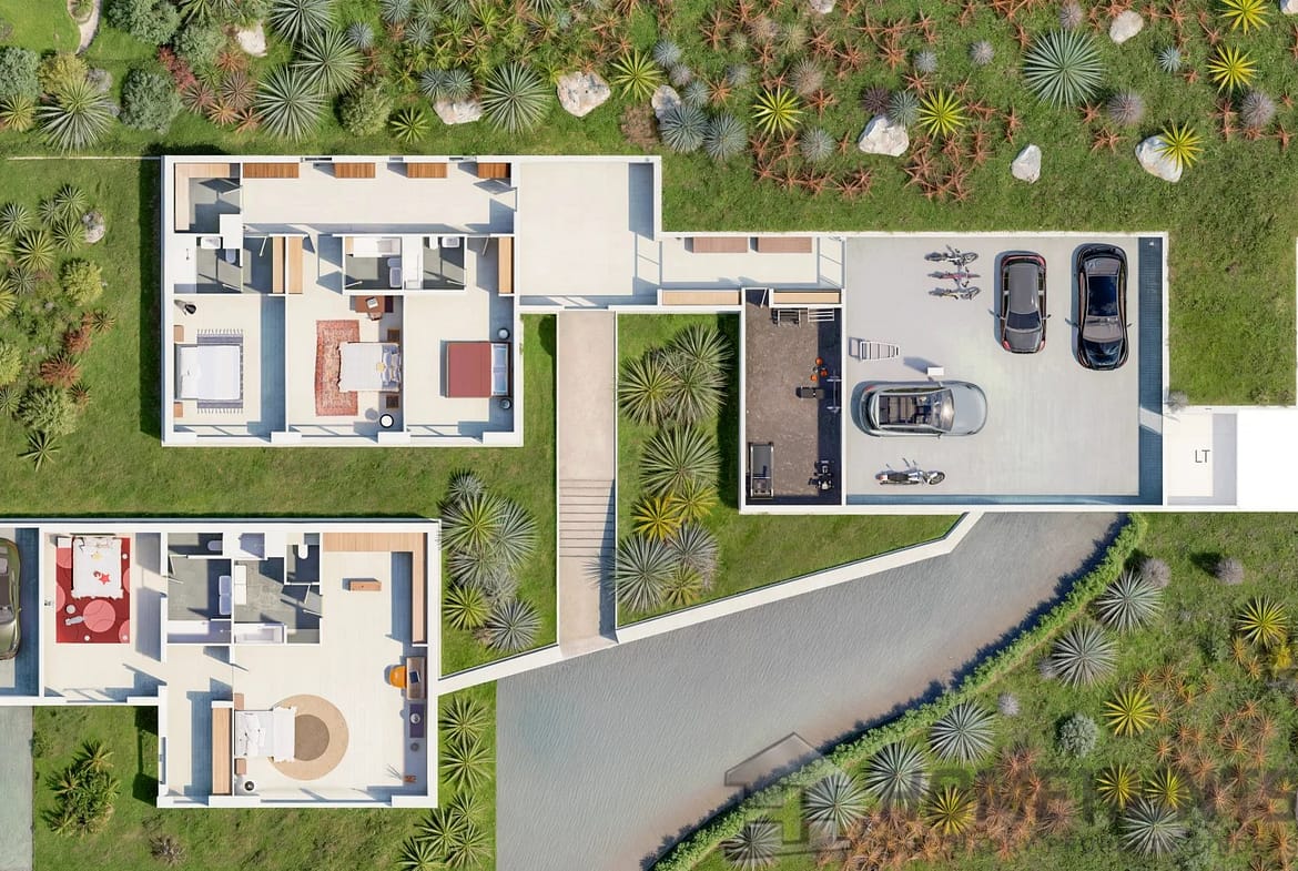 The main villa opens onto a spacious 154 m2 living room with open kitchen, bathed in natural light. It also features a 44 m2 master suite, five elegant bedrooms with en suite bathrooms, and a 30 m2 gym.