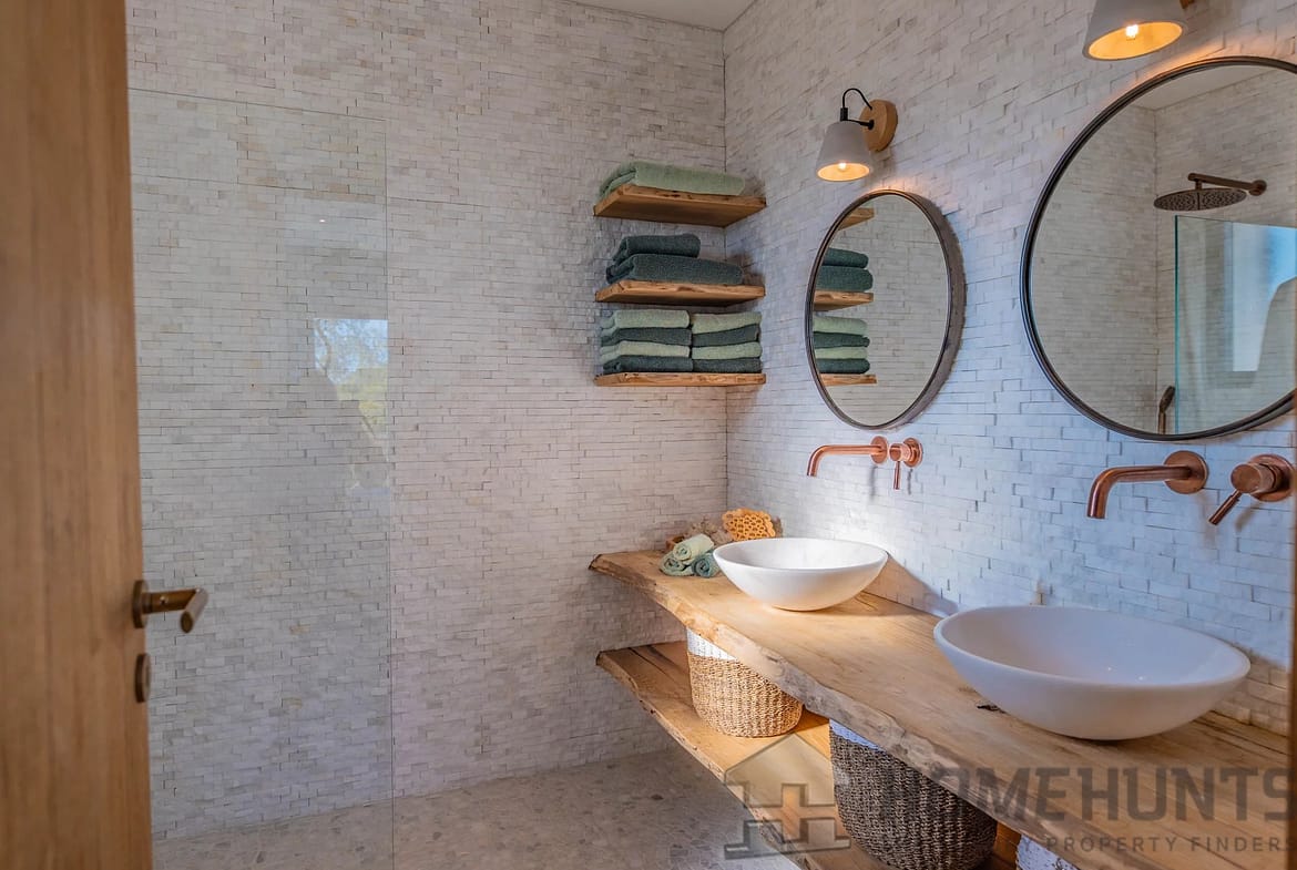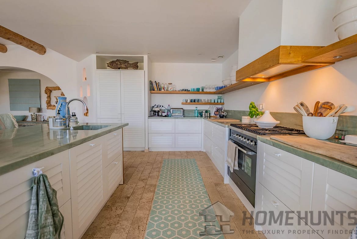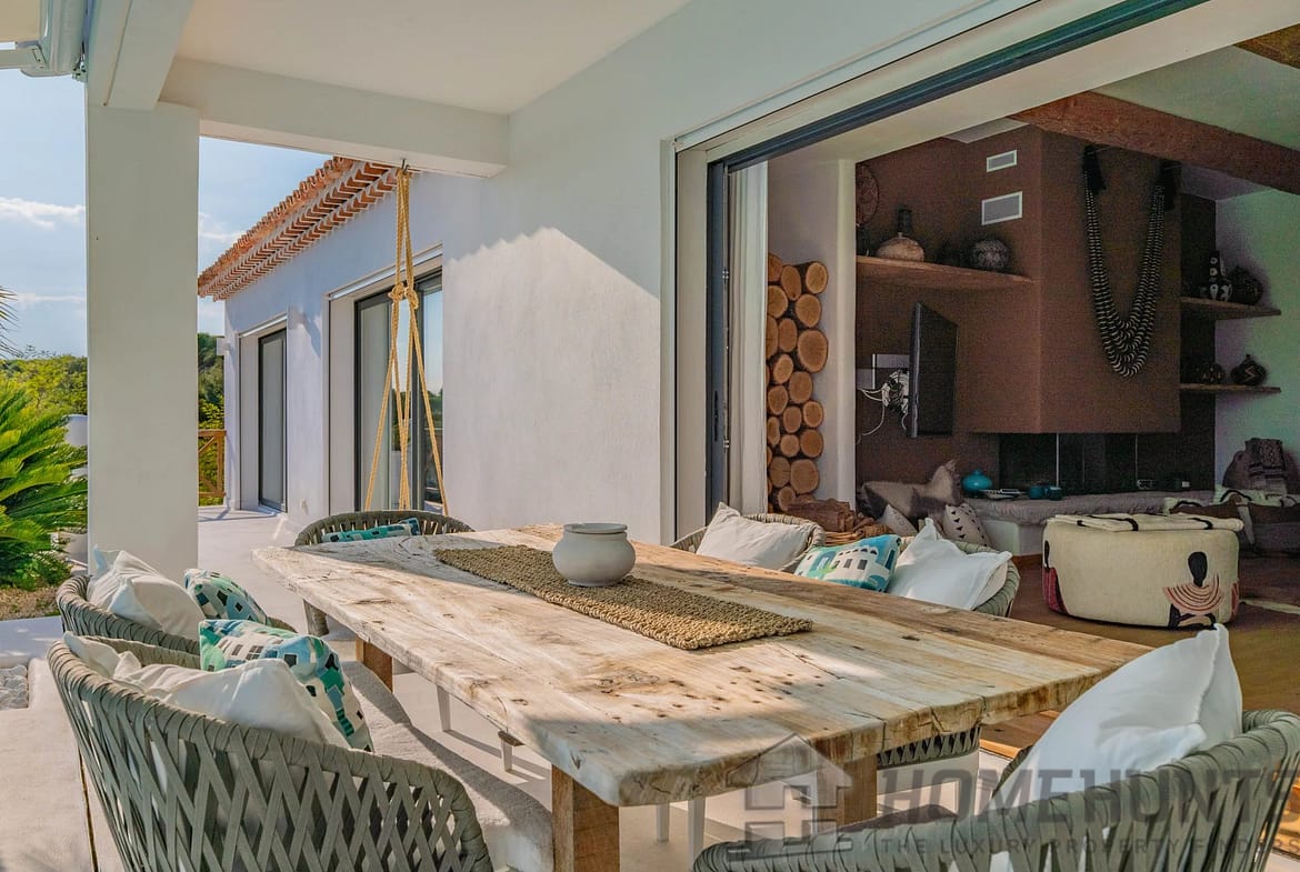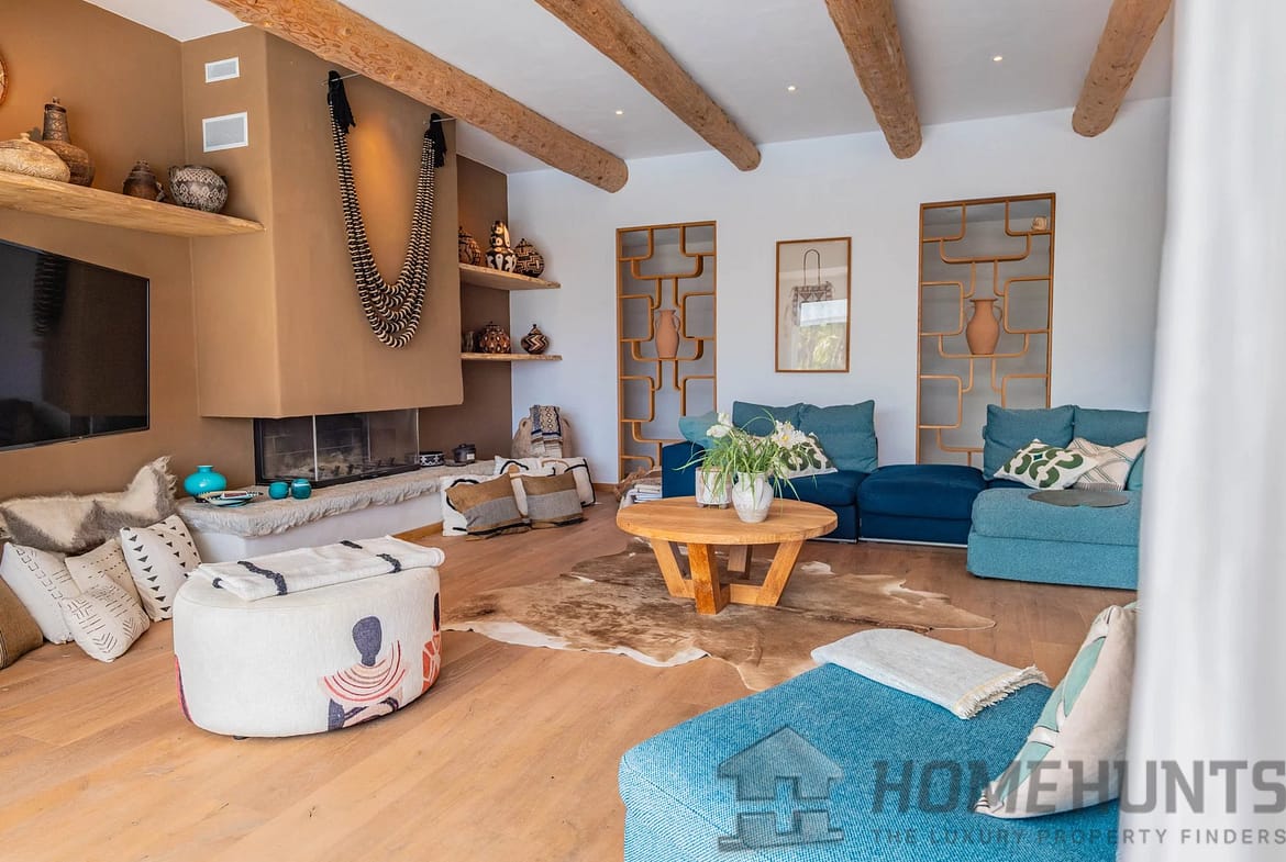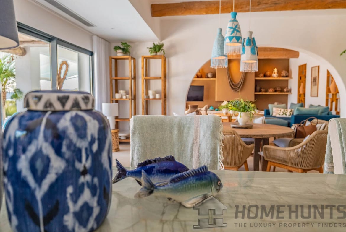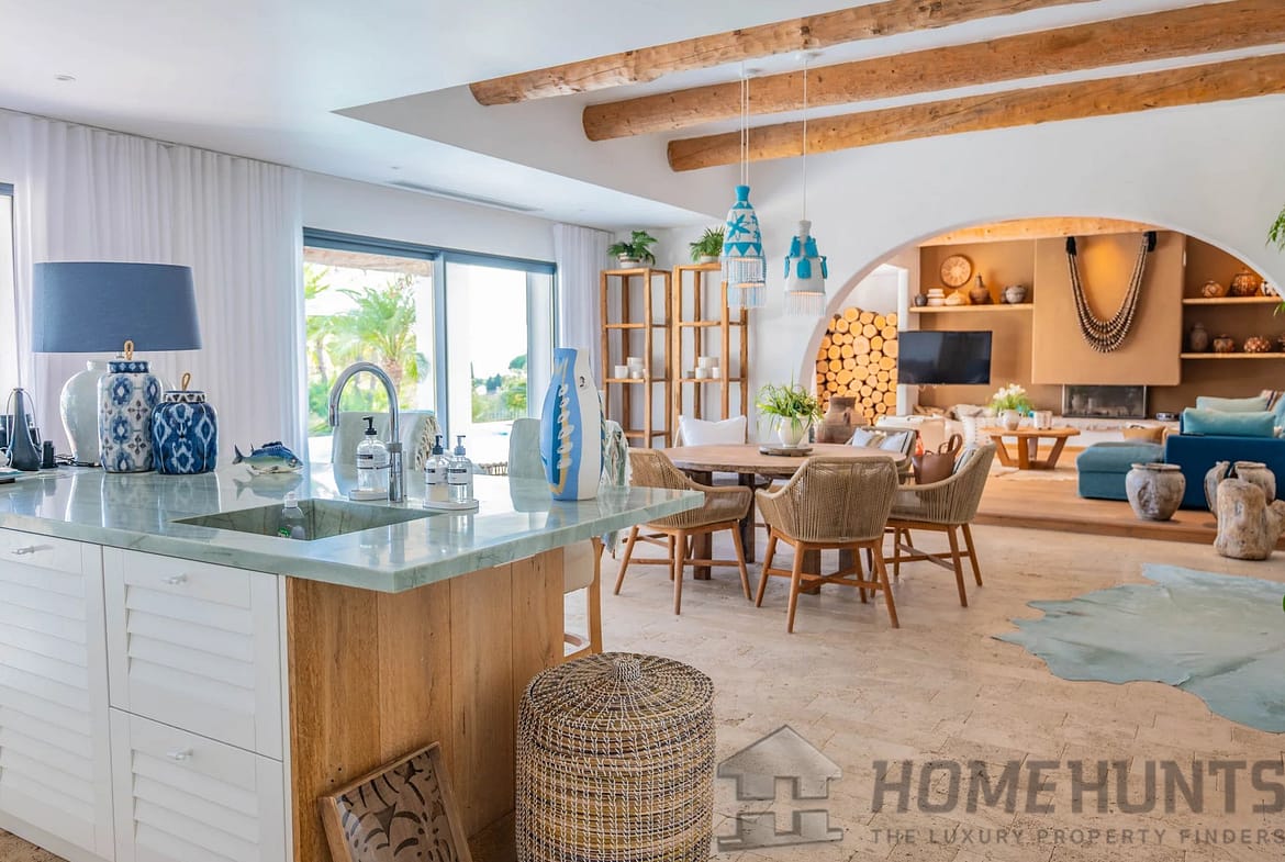 All on one level, the villa comprises an entrance hall, an open-plan kitchen leading to a spacious living and dining area with a fireplace, four bedrooms, and a utility room.
