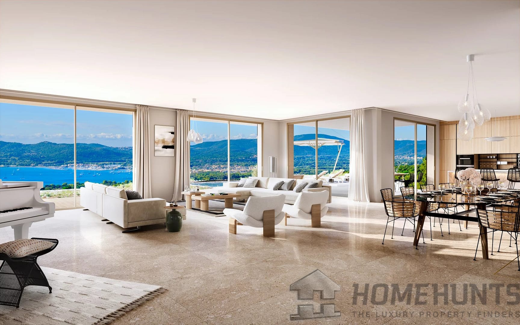 Outside, a carefully designed landscaped garden surrounds a magnificent swimming pool, revealing unobstructed views of the sea and hills — an ideal setting to fully enjoy the calm and beauty of the surroundings.