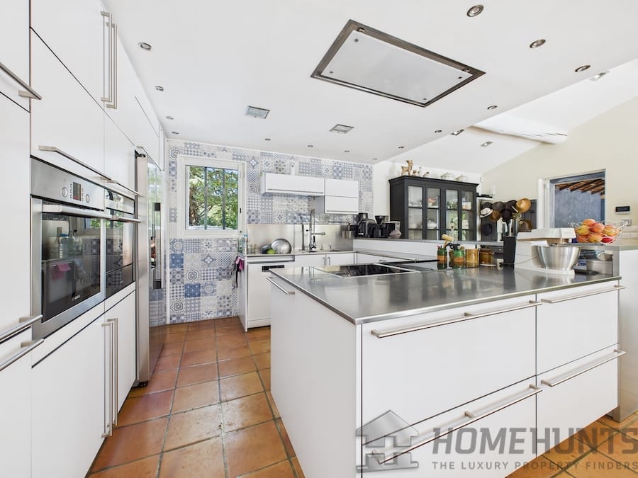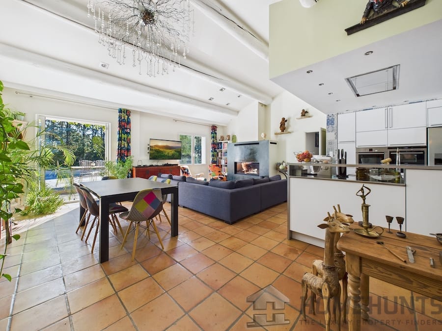 – Large 60 m2 living room with insert fireplace, cathedral ceiling, sliding glass doors and professional kitchen (steam oven, built-in deep fryer, Roblin 903 m3/h extractor hood, etc.)