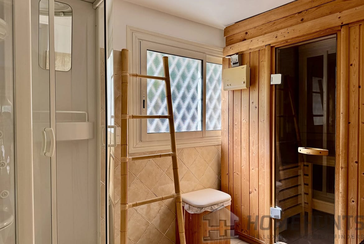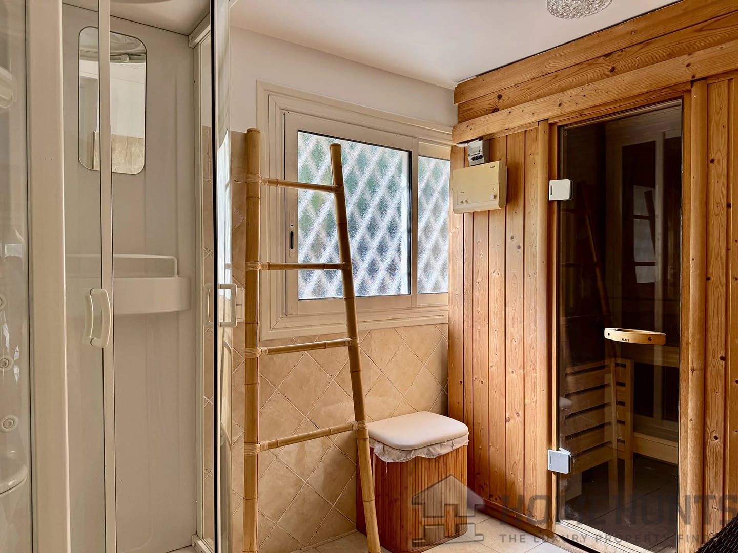 The ground floor features three en-suite bedrooms, including one with a private sauna, all opening directly onto the terrace and the 12m mosaic swimming pool designed by artist Michael Cassini.