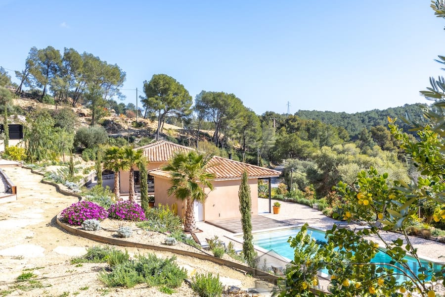 Just 5 minutes from the Dolce Fregate golf course in Saint-Cyr-sur-Mer and in the heart of the greenery and country lanes of La Cadiere d’Azur, discover this magnificent property of over 200 m2 with top-of-the-range features and a contemporary feel, set in grounds of around 4000 m2 planted with Mediterranean trees.