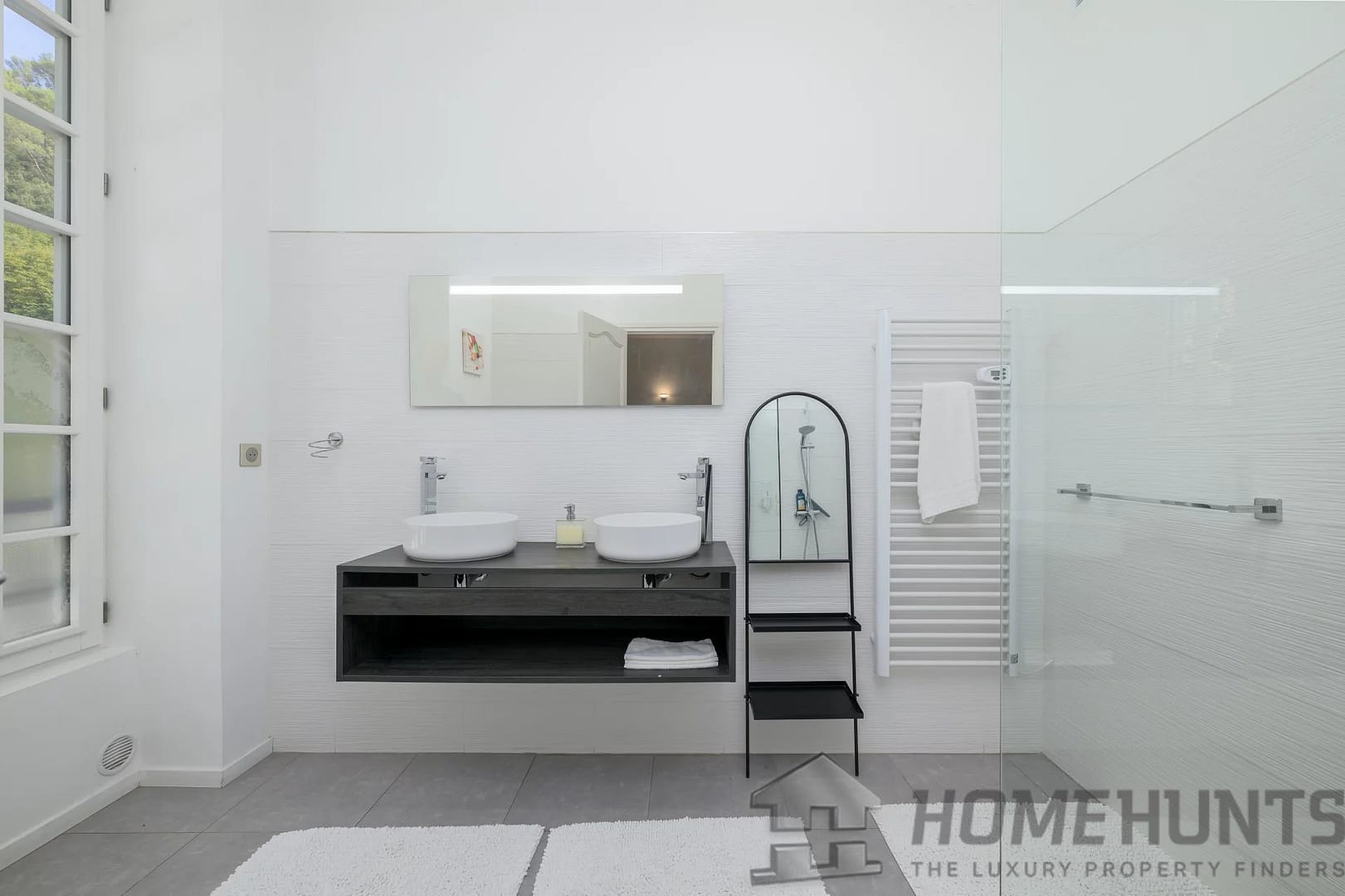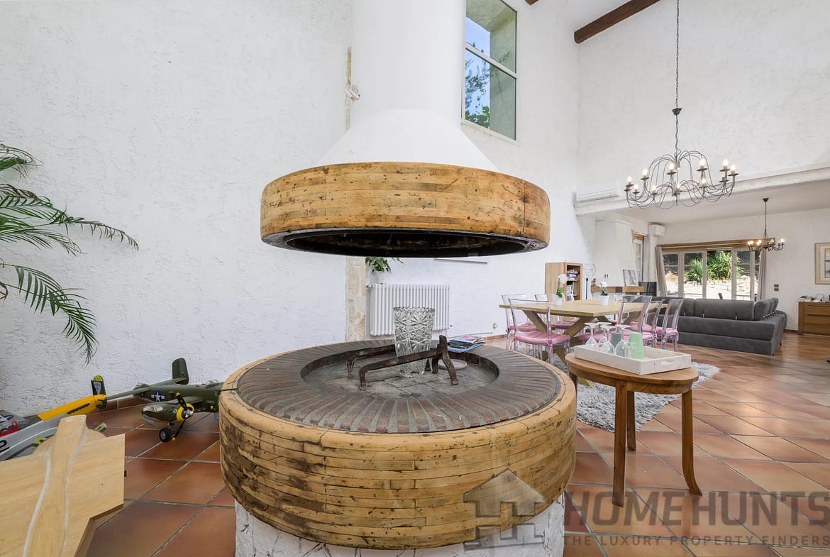 The villa’s bright, spacious interior is perfect for welcoming family and friends. The dining room, with its high vaulted ceiling, is the ideal setting for dinner parties. Large openings allow natural light to flood in, adding to the special ambience of the location near the river in this natural park.