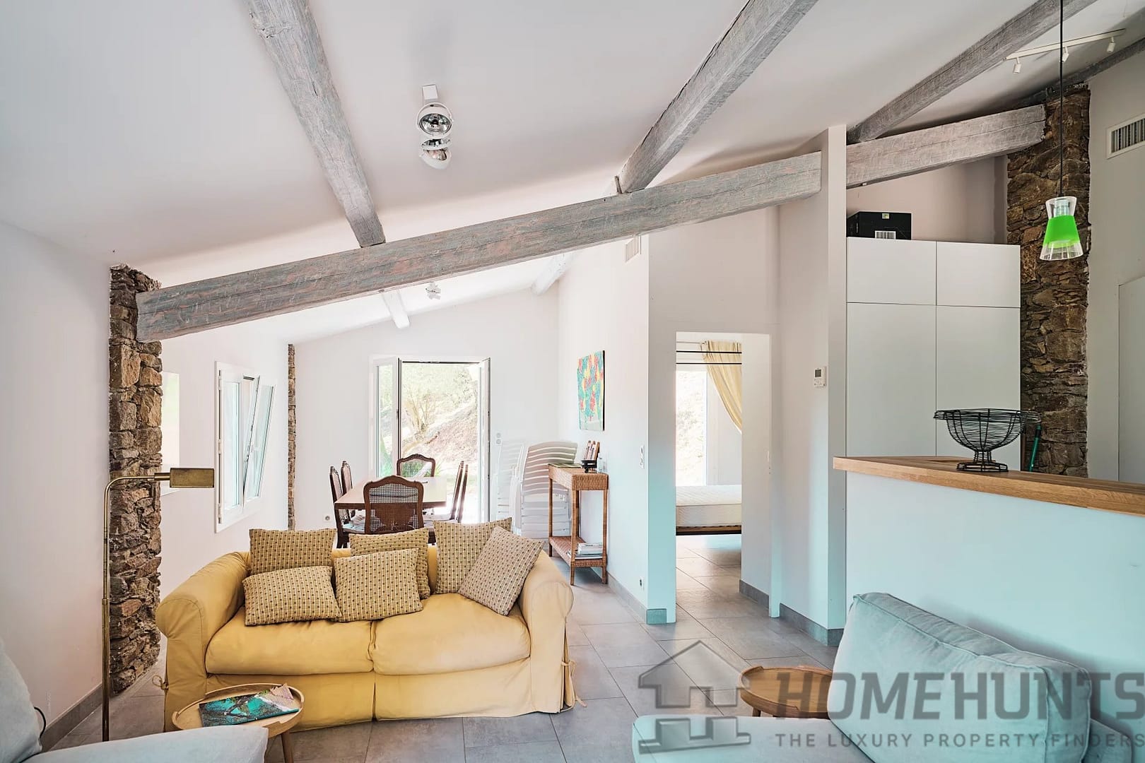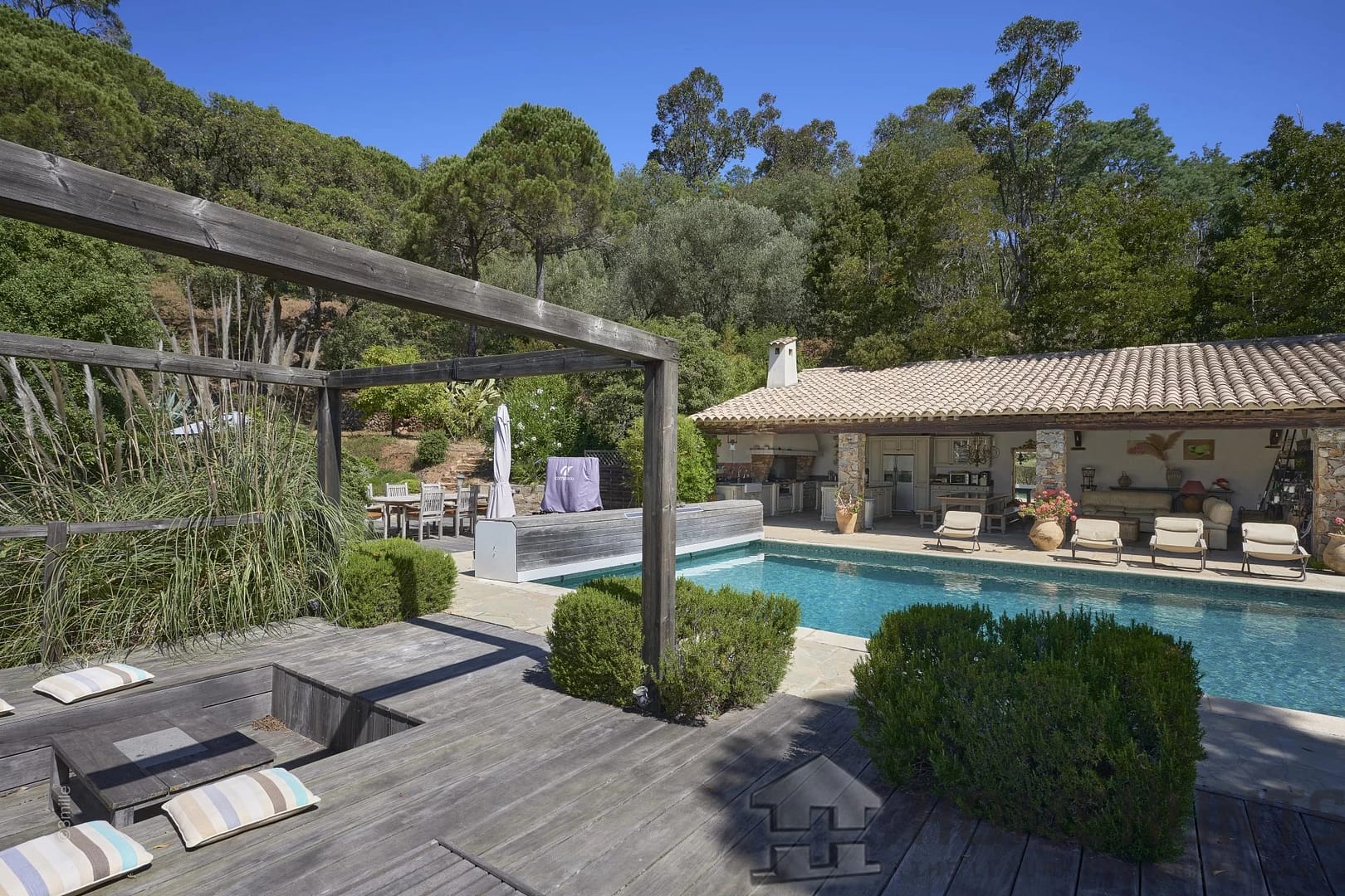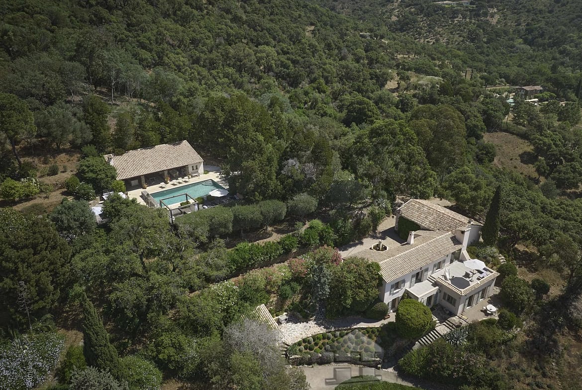 The main house enjoys a living room with fireplace open to a dining room and a fully equipped kitchen with high-end brand, a master bedroom of 60m2 including two offices, a dressing room, a bathroom the whole overlooking a solarium terrace with clear view of the nature of Gigaro as well as a glimpse of the sea