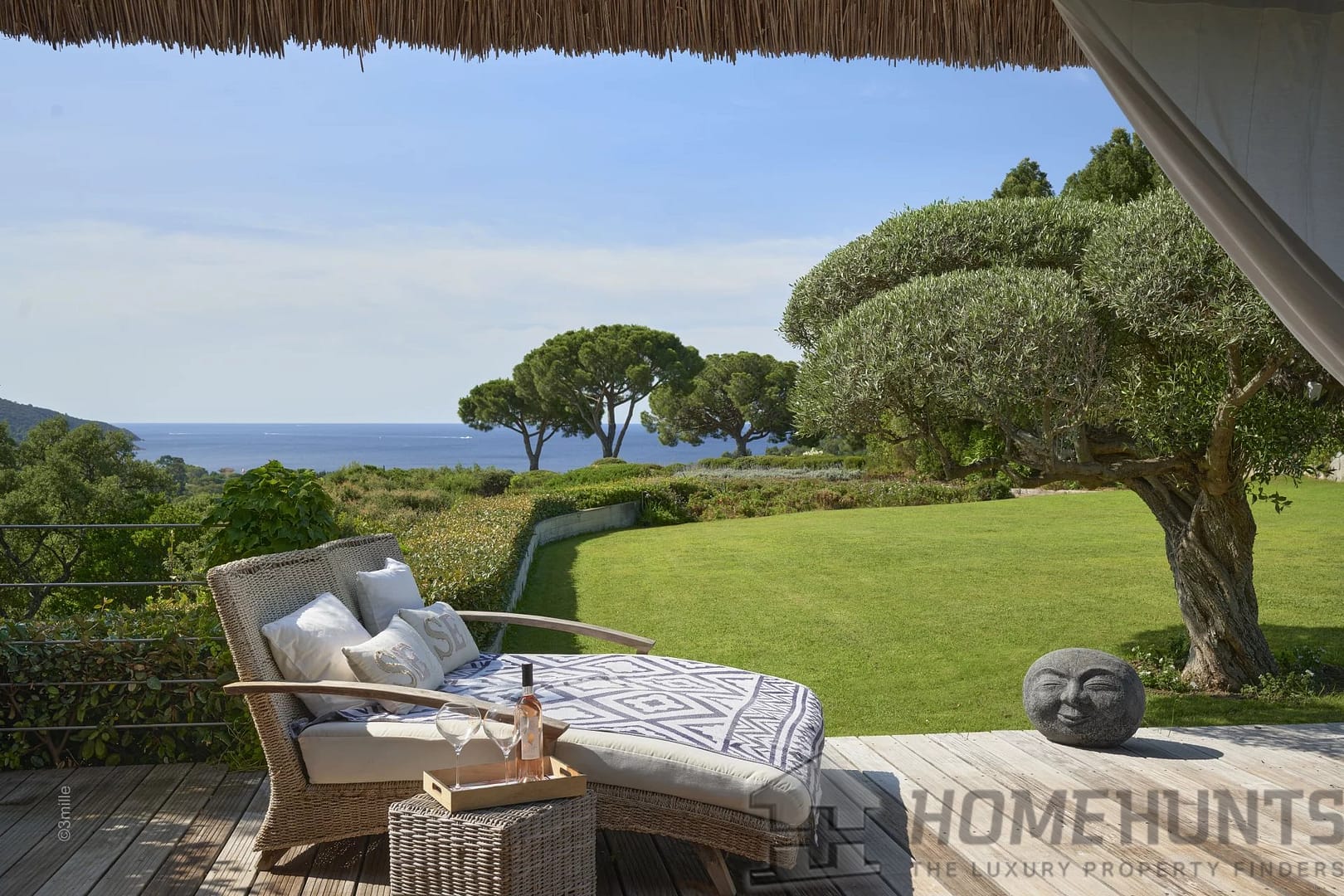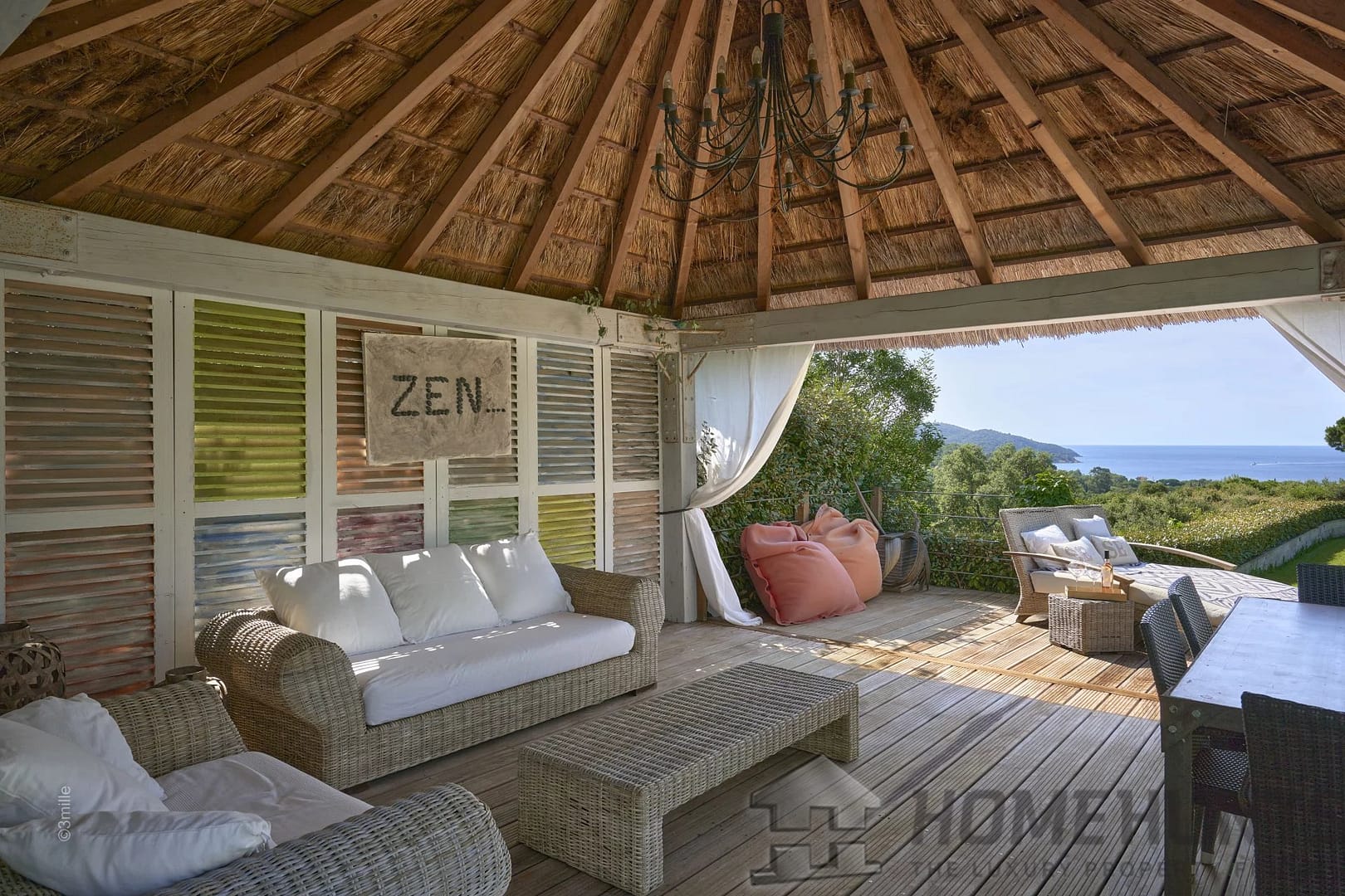 This haven of peace with a sea view on Cap Lardier sits on flat land of 7,500 m2 with Mediterranean species. A large patio is fitted out by a heated swimming pool with counter-current, a gym and a relaxation lounge with Polynesian roofs.