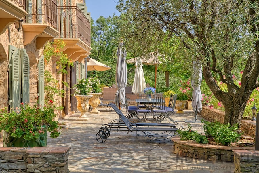 Built on south-facing grounds of 2.2 ha, the house opens onto a well maintained, terraced garden, a tennis court, a beautiful swimming pool and a pool house.
