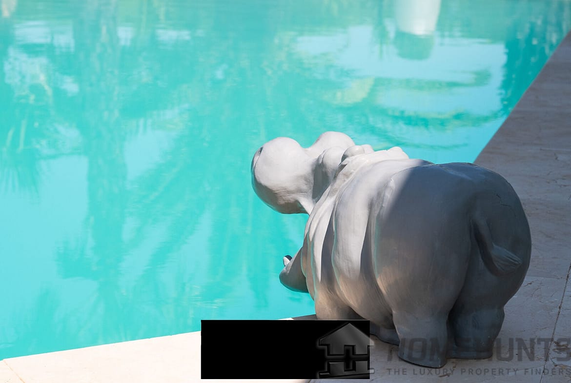 The arrival is via a small path and from the secure gate, a large paved parking lot and its carport welcome us. Then the entrance quickly makes us discover the white and refined universe of the vast living room with right-angled windows opening onto the terrace. The eye is drawn to the azure expanse of the infinity pool against the green backdrop of the surrounding countryside and the garden below with its palm tree plantations. On one level, the villa, with a star-shaped plan, develops its 150 m2 in two distinct parts: the living area with its living room and its open kitchen with white marble worktop, its equipped back kitchen serving as a laundry room and direct access to the 40 m2 garage.