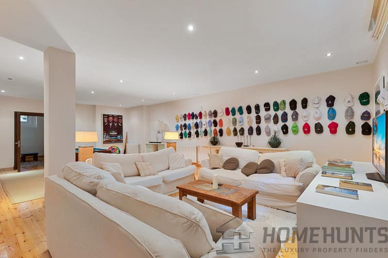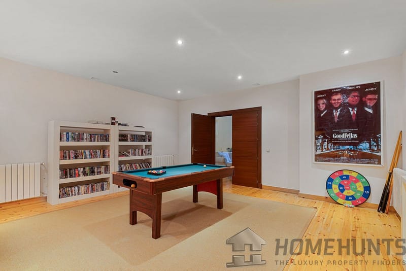 The basement offers a cinema corner, wine cellar, games room with pool table, and another guest suite with private bathroom.