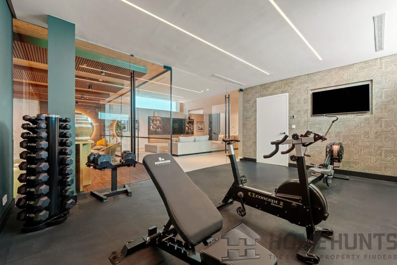 An entire level is dedicated to wellness and leisure, featuring a fully equipped gym, spa facilities, and a contemporary indoor pool. A separate entertainment area adds versatility, perfect for a home cinema, games, or social gatherings. The thoughtful integration of these features establishes the residence as a complete lifestyle home.