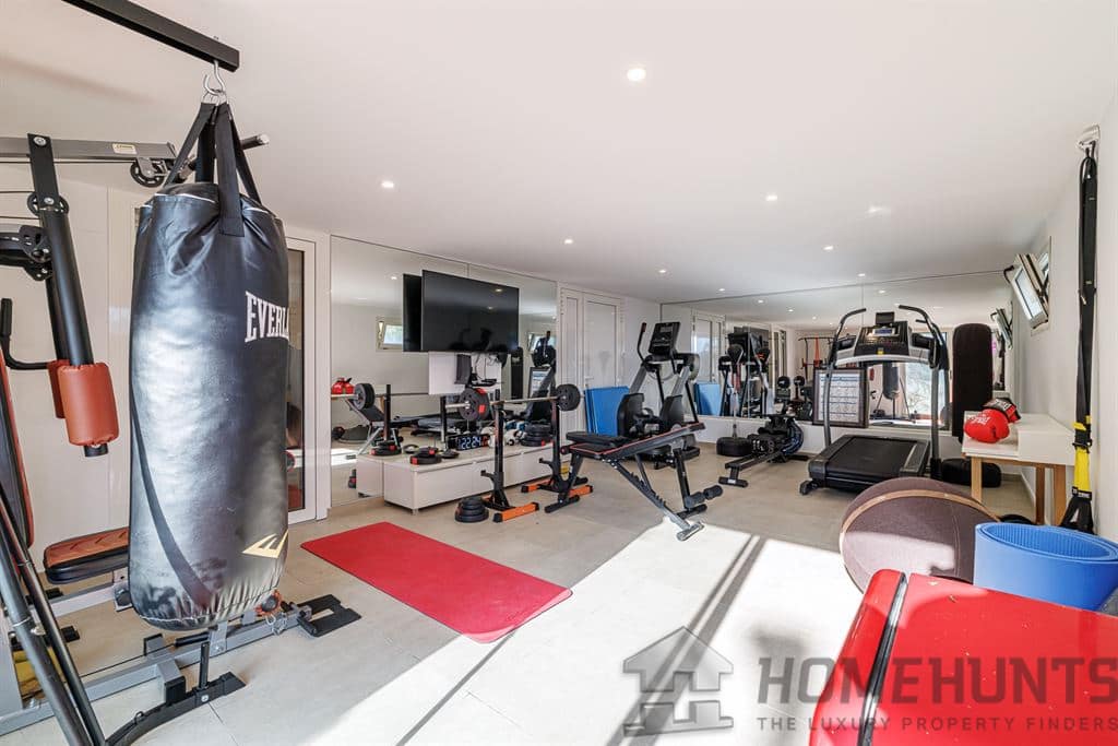 On the garden level, a wellness area includes a gym, wine cellar, and workshop.