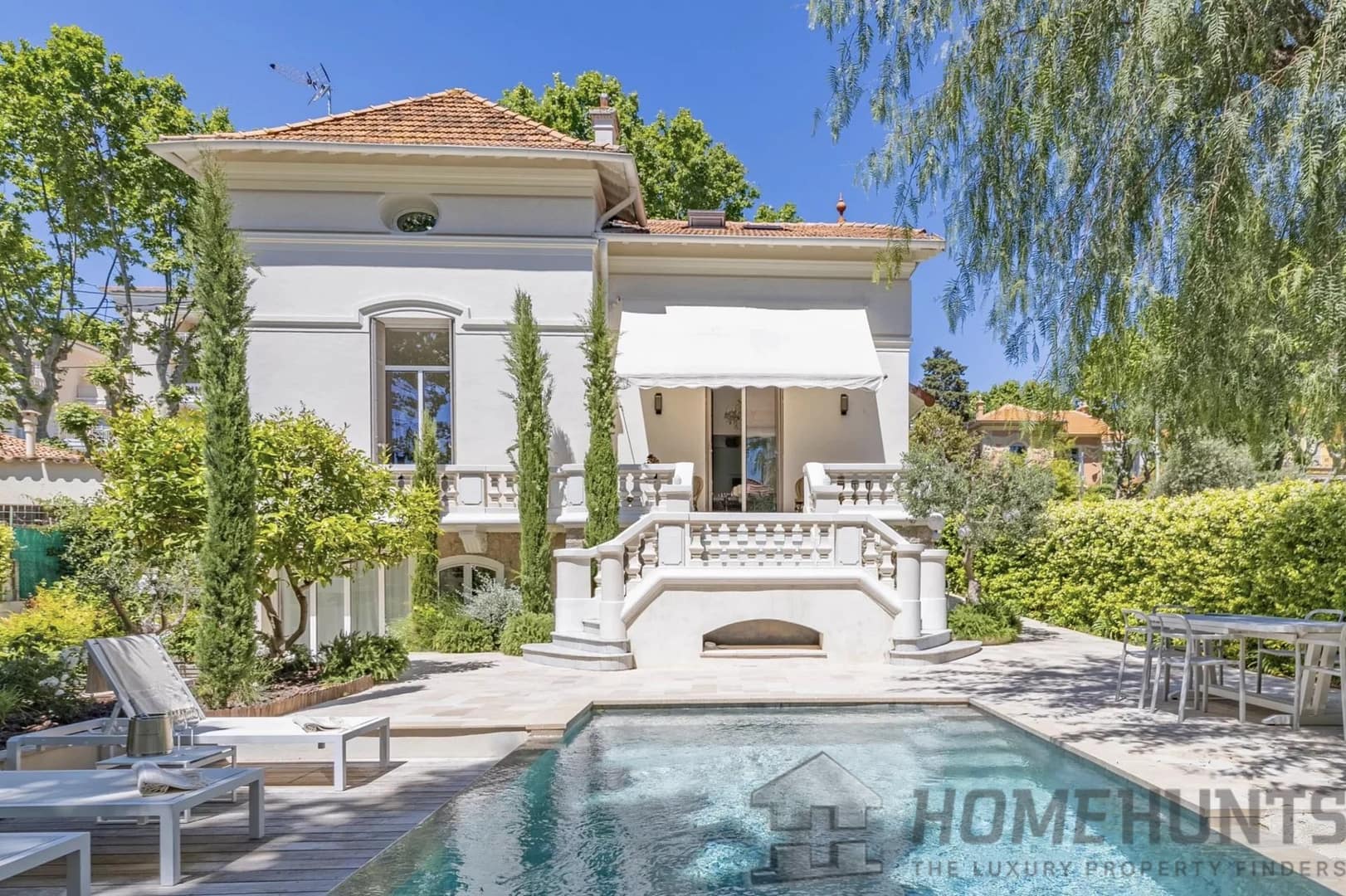 The property boasts a beautifully landscaped garden with a swimming pool in a private, non-overlooked setting, perfect for enjoying the French Riviera lifestyle.