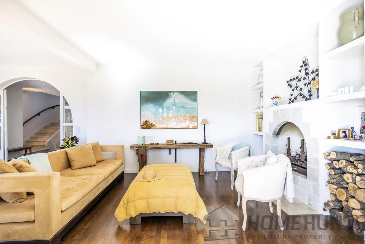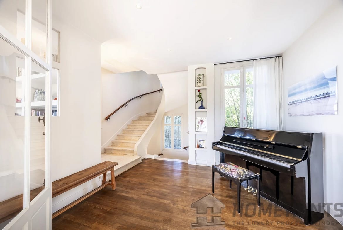 The first floor features a double living room with two fireplaces, a very large kitchen with dining area, a piano room and an office.