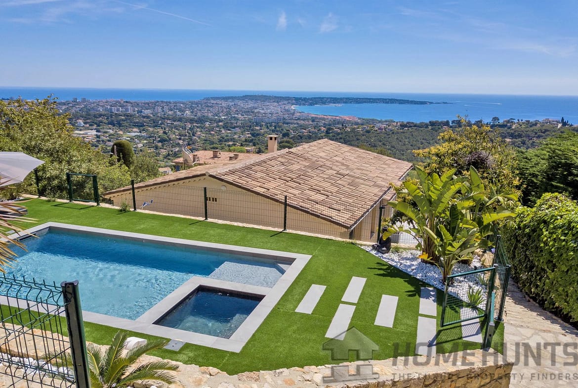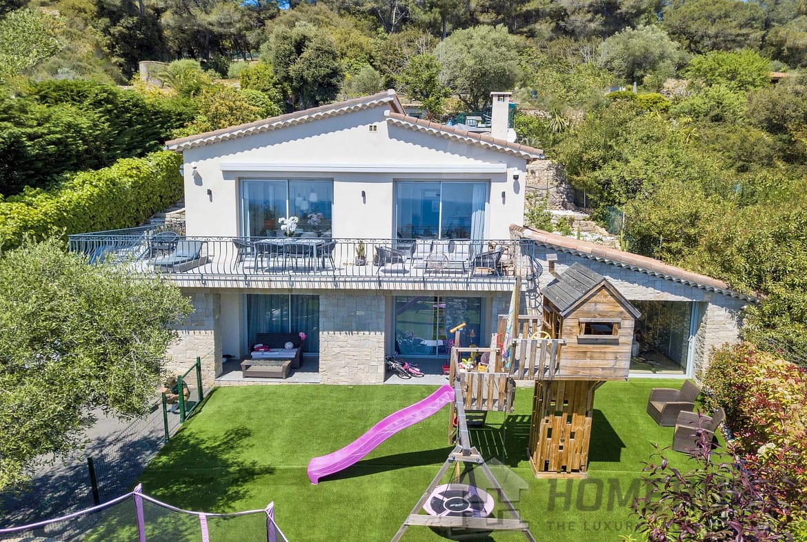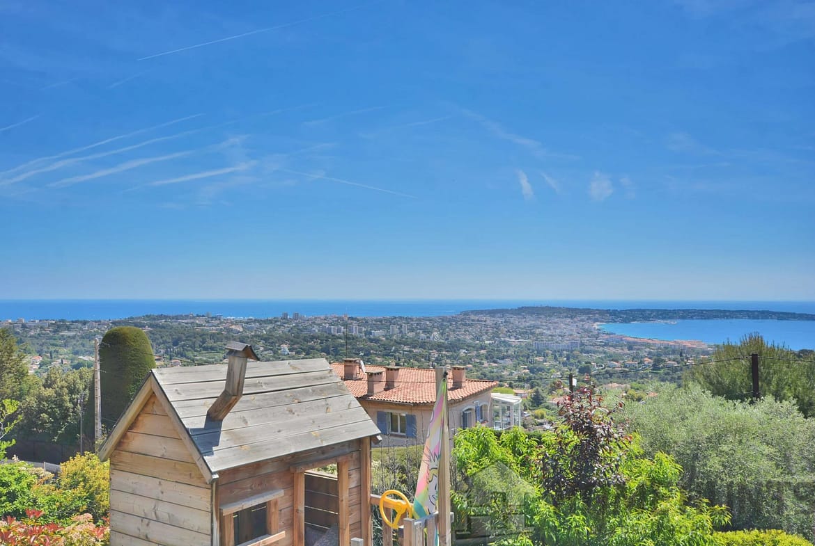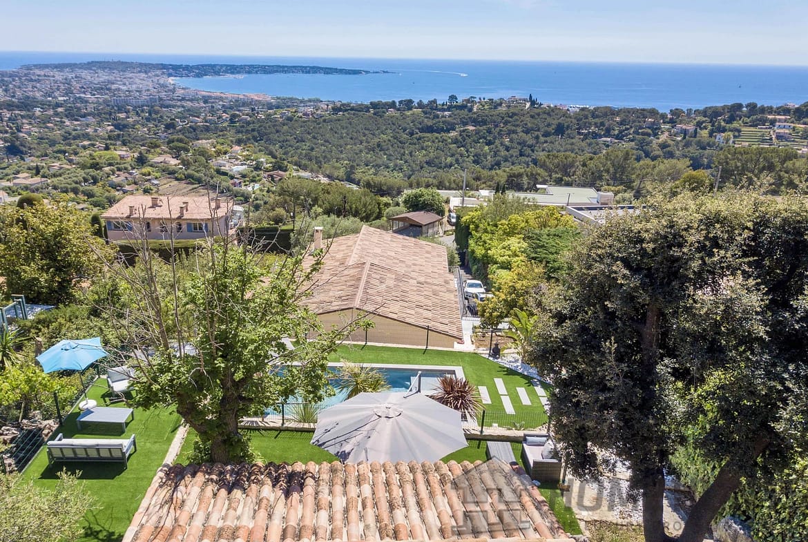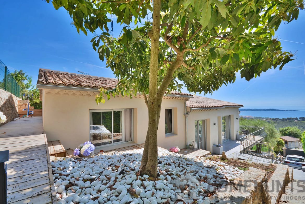 Above the charming yacht port of Golf Juan, in a sought after residential area, beautiful villa entirely renovated with quality fittings and benefiting from a panoramic sea view from Cap Martin to the Lerins islands in absolute calm.