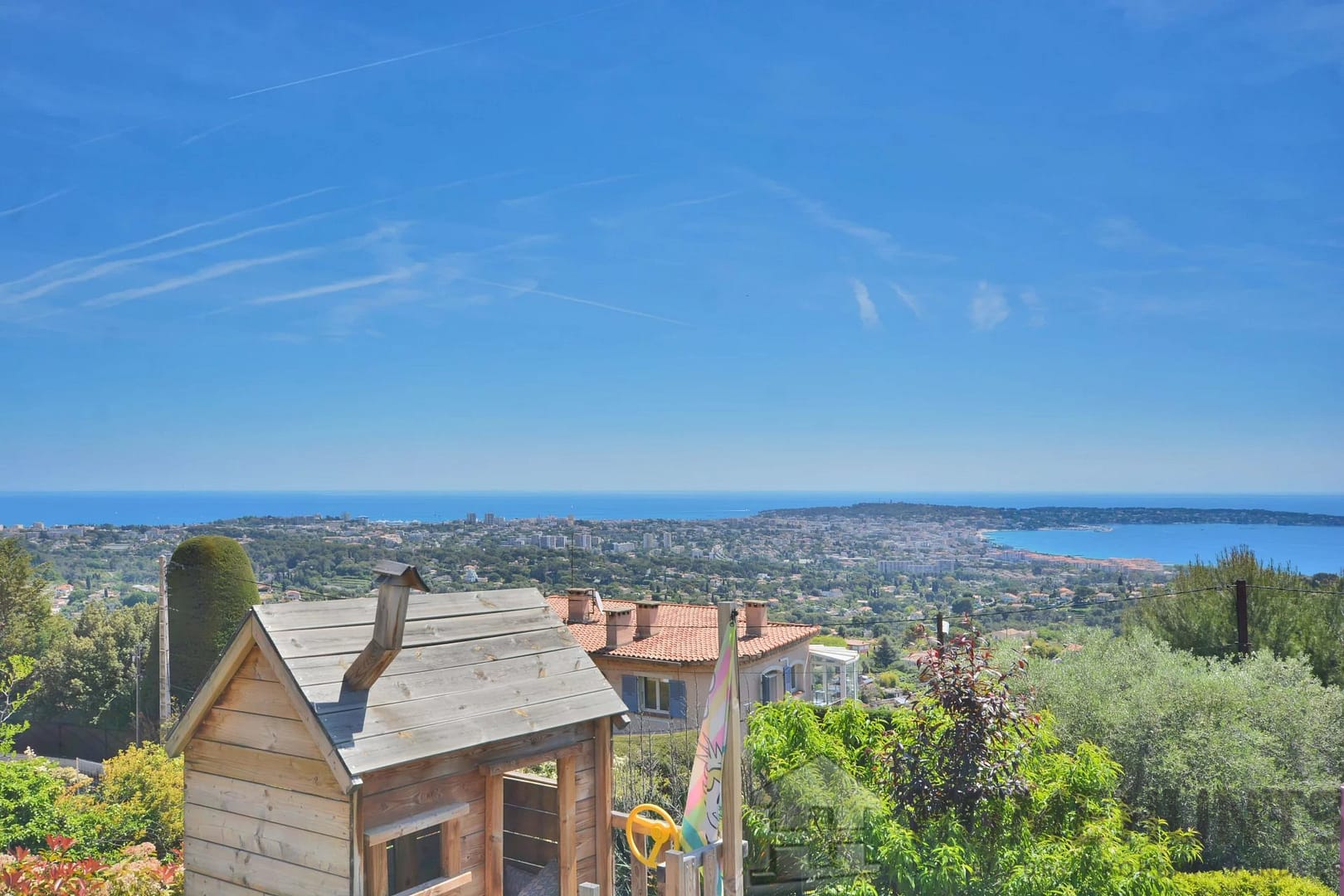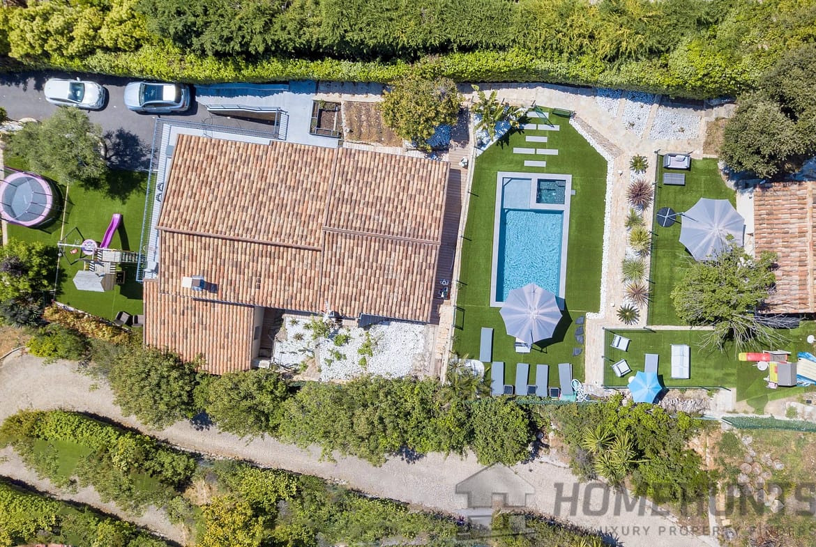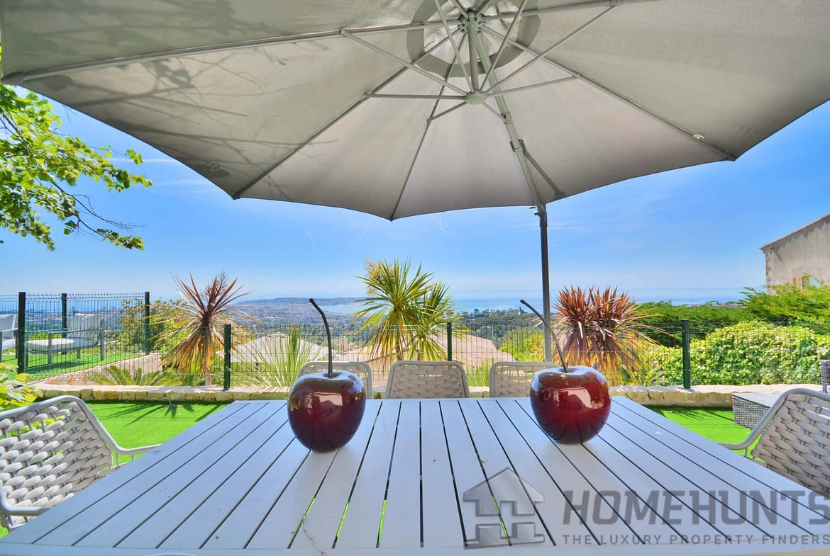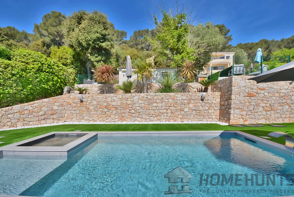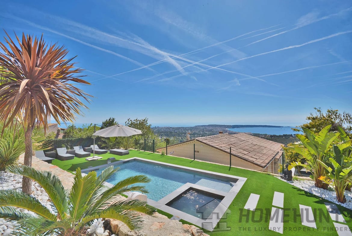 Above the charming yacht port of Golf Juan, in a sought after residential area, beautiful villa entirely renovated with quality fittings and benefiting from a panoramic sea view from Cap Martin to the Lerins islands in absolute calm.
