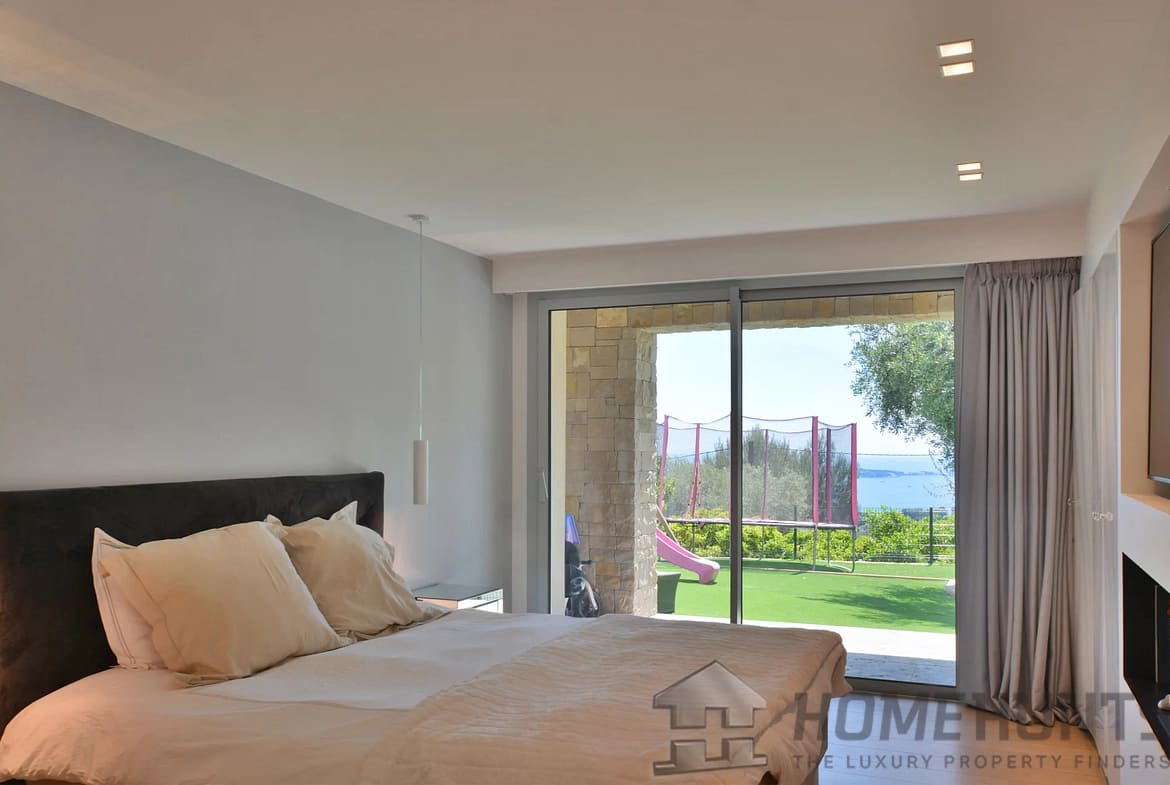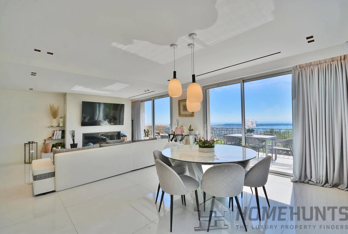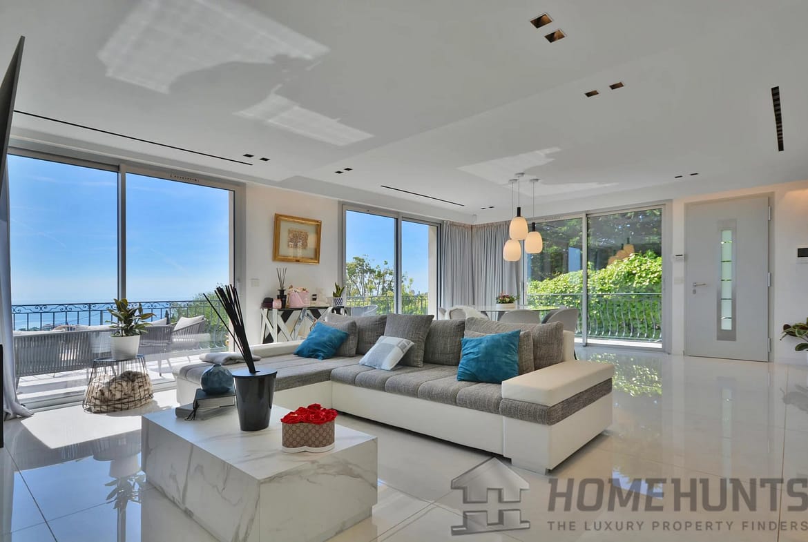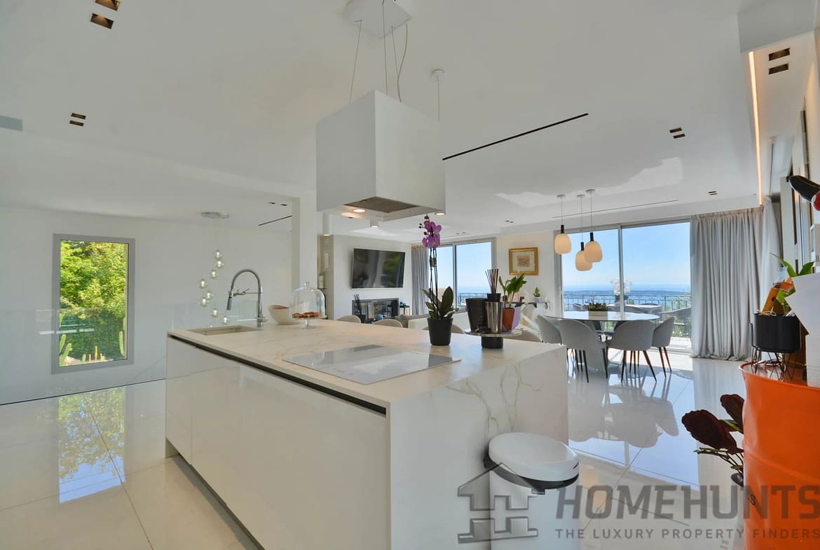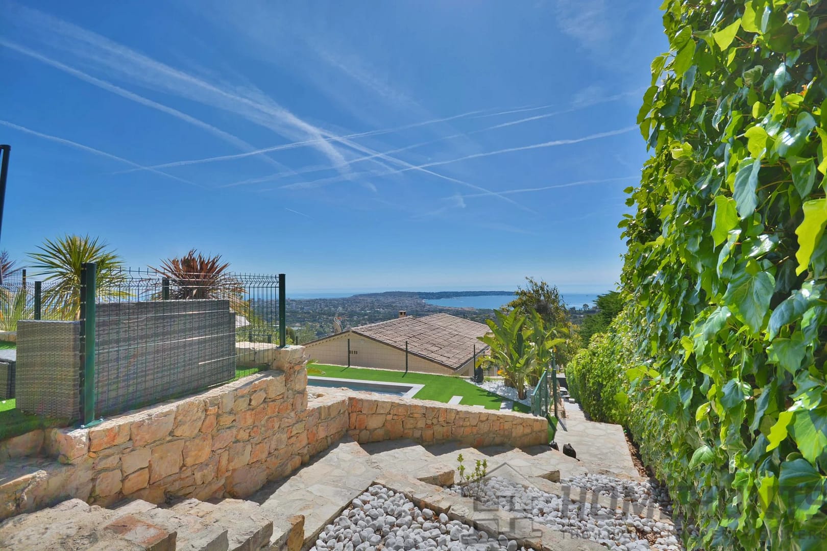 Above the charming yacht port of Golf Juan, in a sought after residential area, beautiful villa entirely renovated with quality fittings and benefiting from a panoramic sea view from Cap Martin to the Lerins islands in absolute calm.