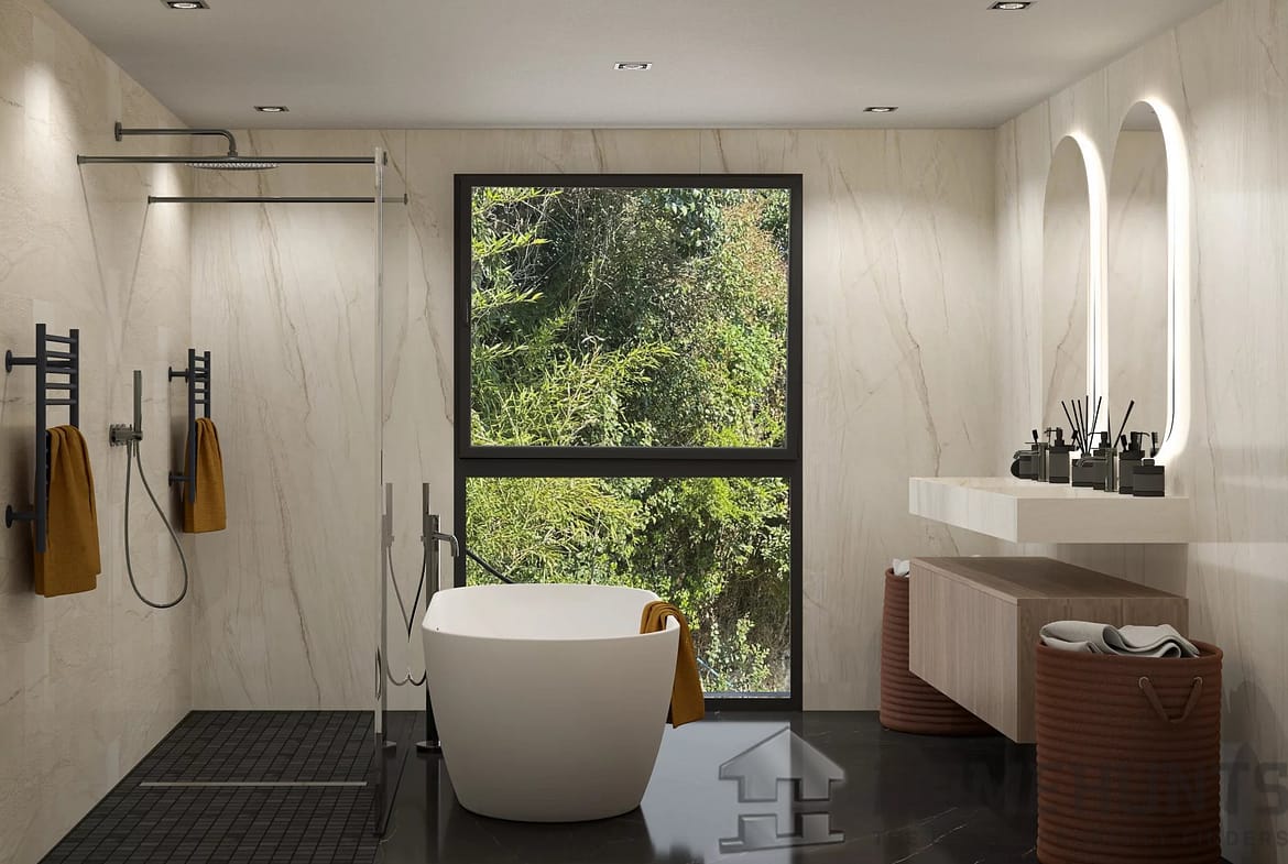 On the garden level, there is another master bedroom with en-suite bathroom, walk-in closet, and WC, along with two additional en-suite bedrooms, each with their own shower room.