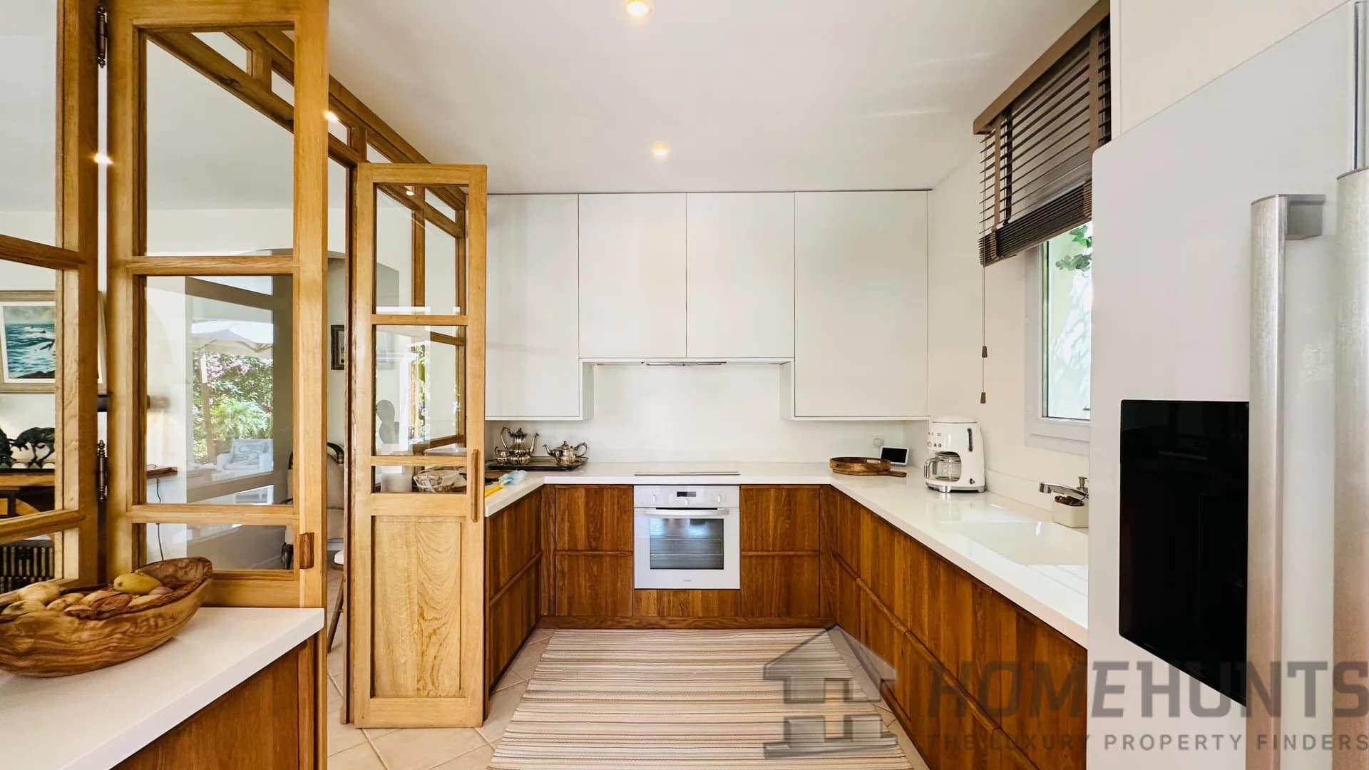 The villa’s generous living spaces include a bright lounge, dining room, and fully equipped kitchen, all opening onto a south-facing shaded terrace, ideal for long summer lunches overlooking the gardens.