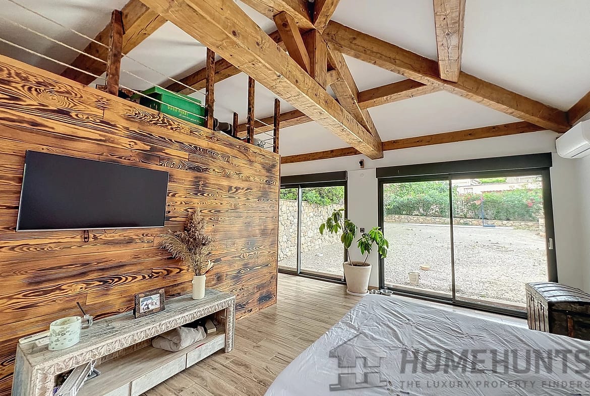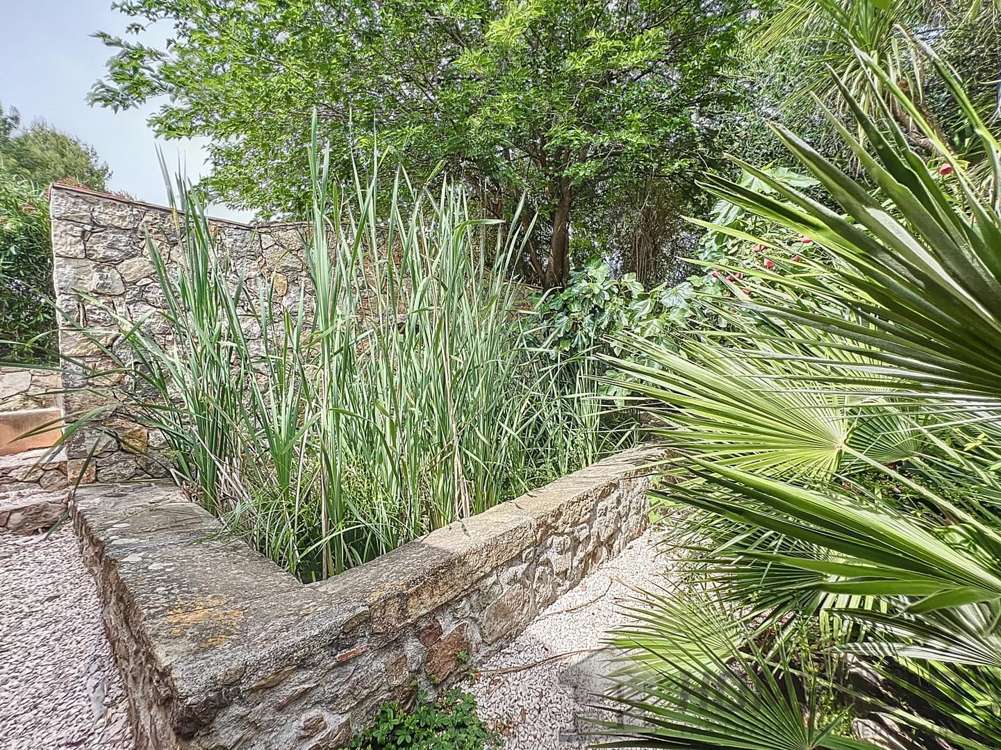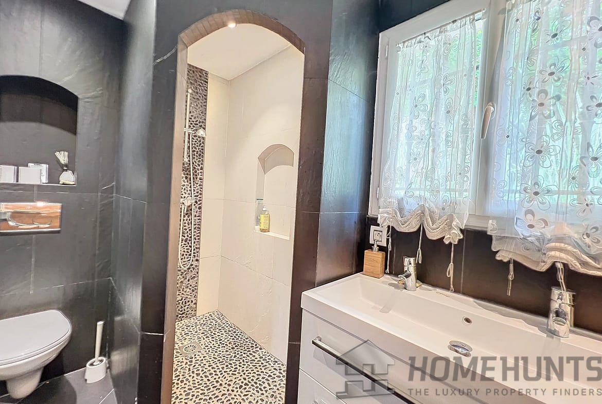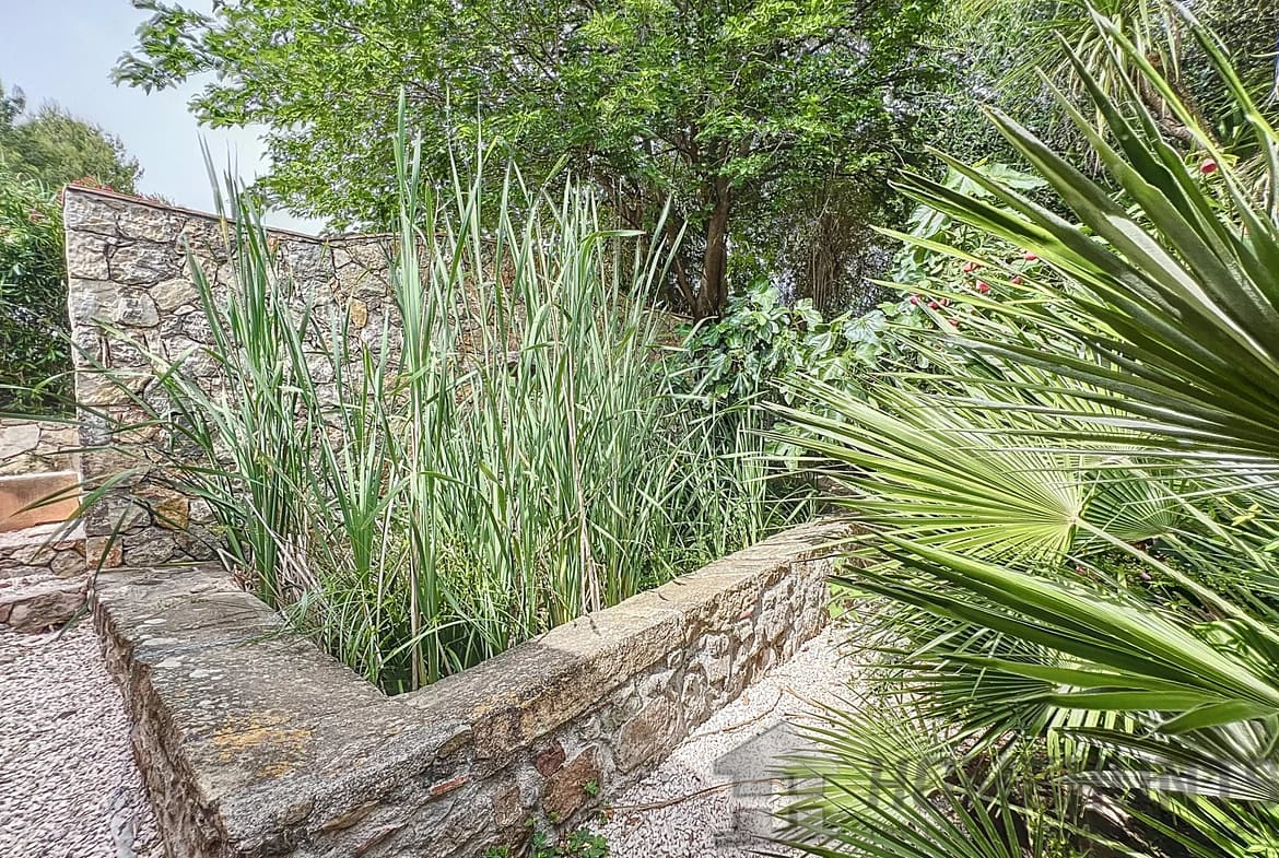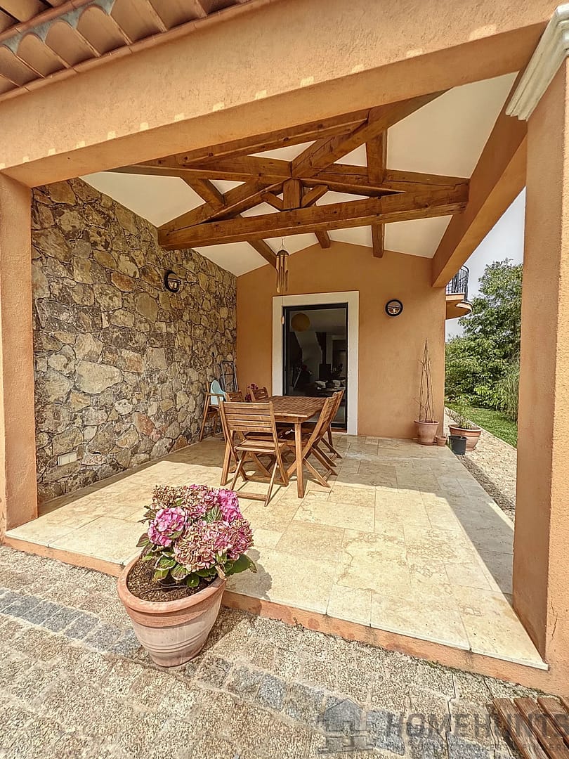 There’s a large graveled driveway and parking area next to the main 150 m2 villa with a vast 70 m2 living room/kitchen, 4 bedrooms, a shower room and a bathroom, opening on one side on a charming patio with palm tree and pound, and on a covered terrace and the pool on the other side, and a 3 room 56 m2 independent apartment just perfect for visiting guests.