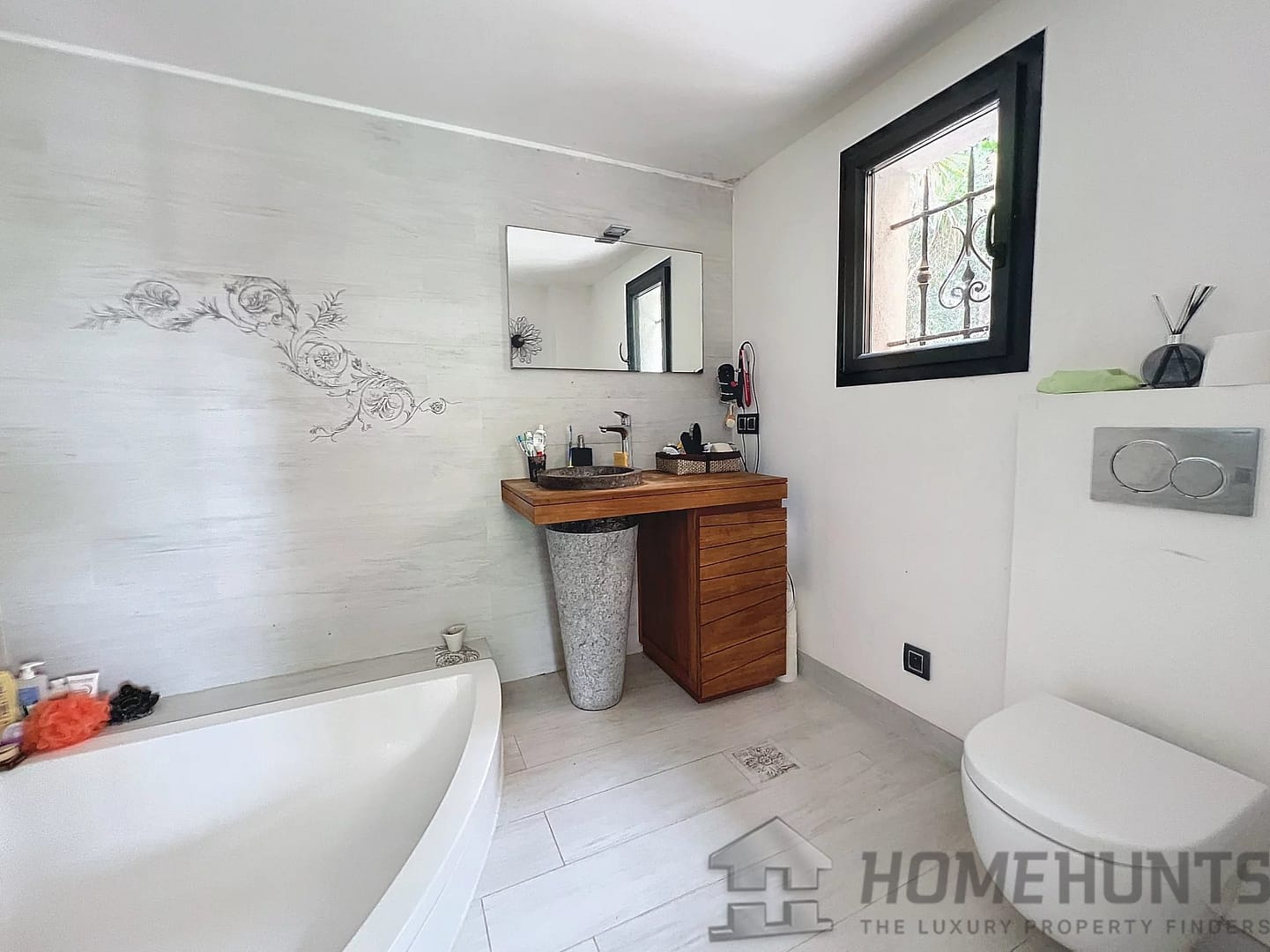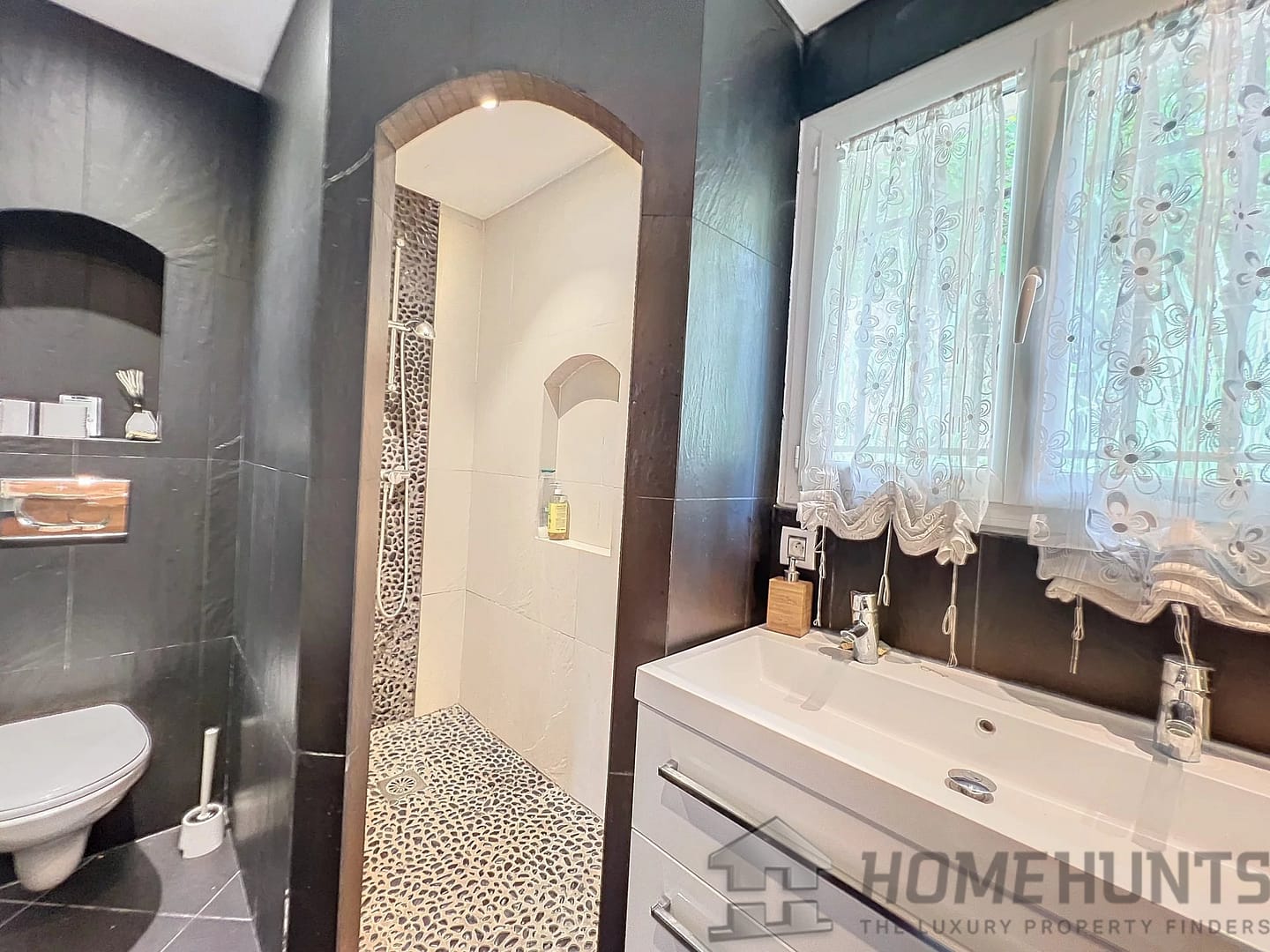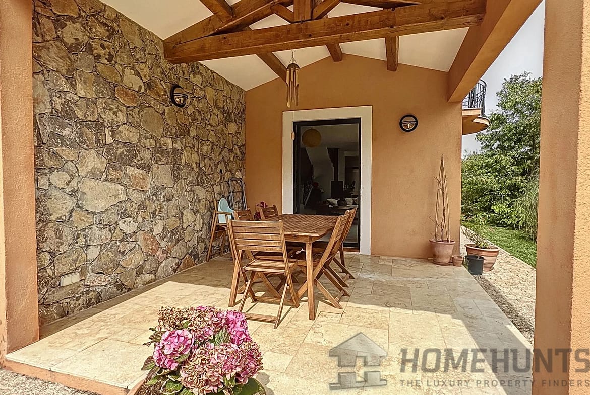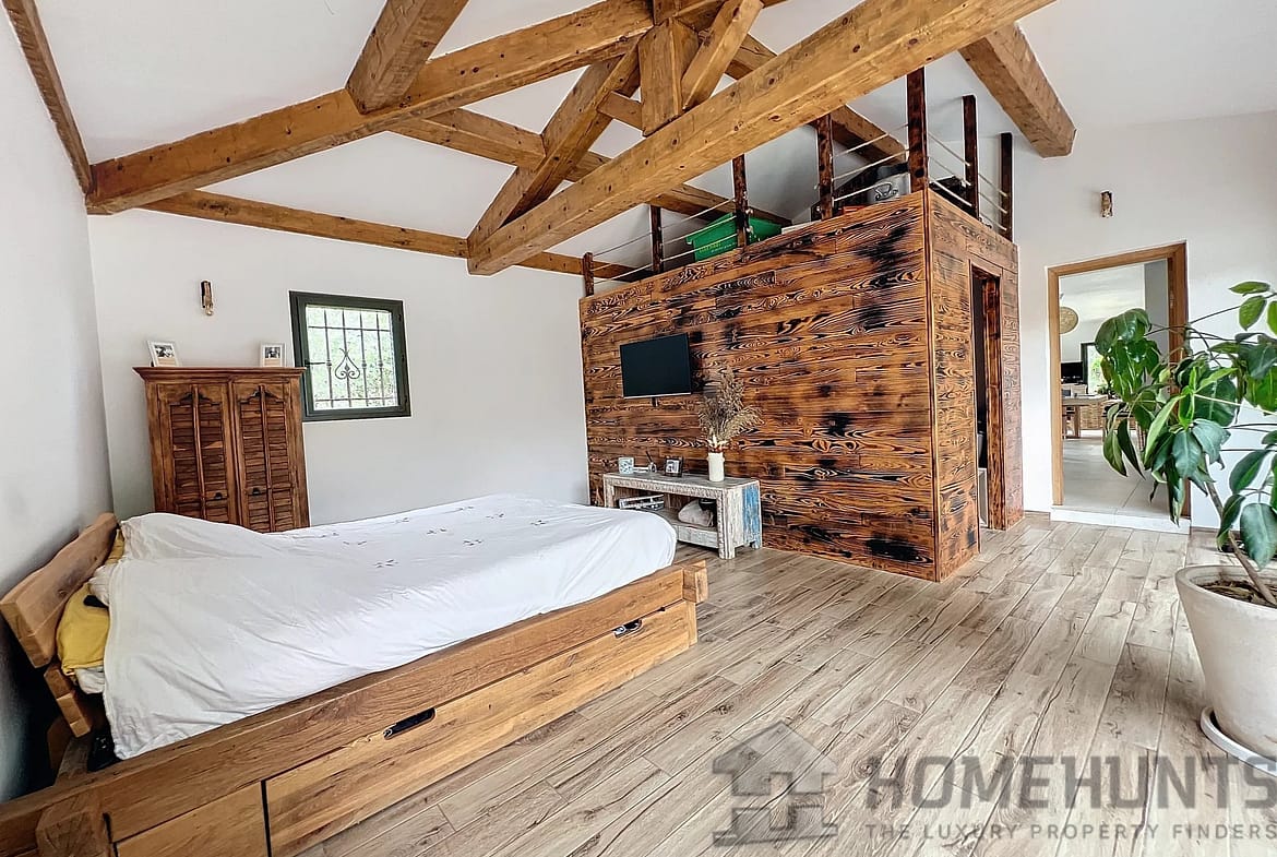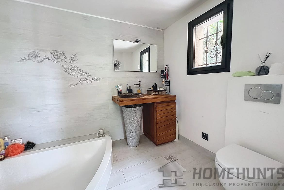 There’s a large graveled driveway and parking area next to the main 150 m2 villa with a vast 70 m2 living room/kitchen, 4 bedrooms, a shower room and a bathroom, opening on one side on a charming patio with palm tree and pound, and on a covered terrace and the pool on the other side, and a 3 room 56 m2 independent apartment just perfect for visiting guests.