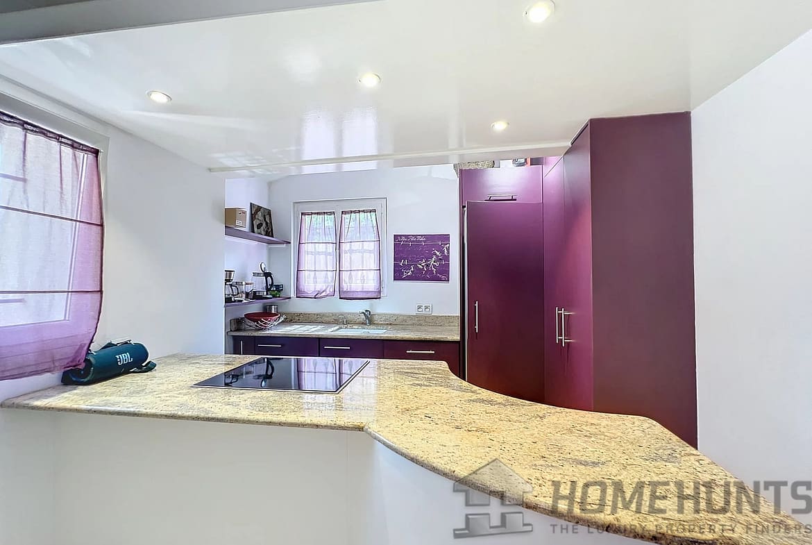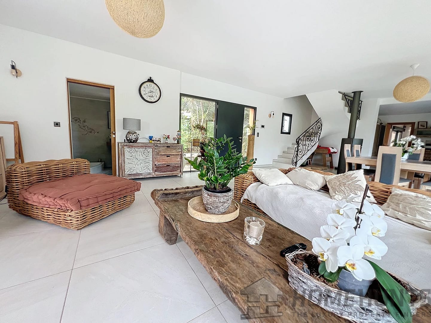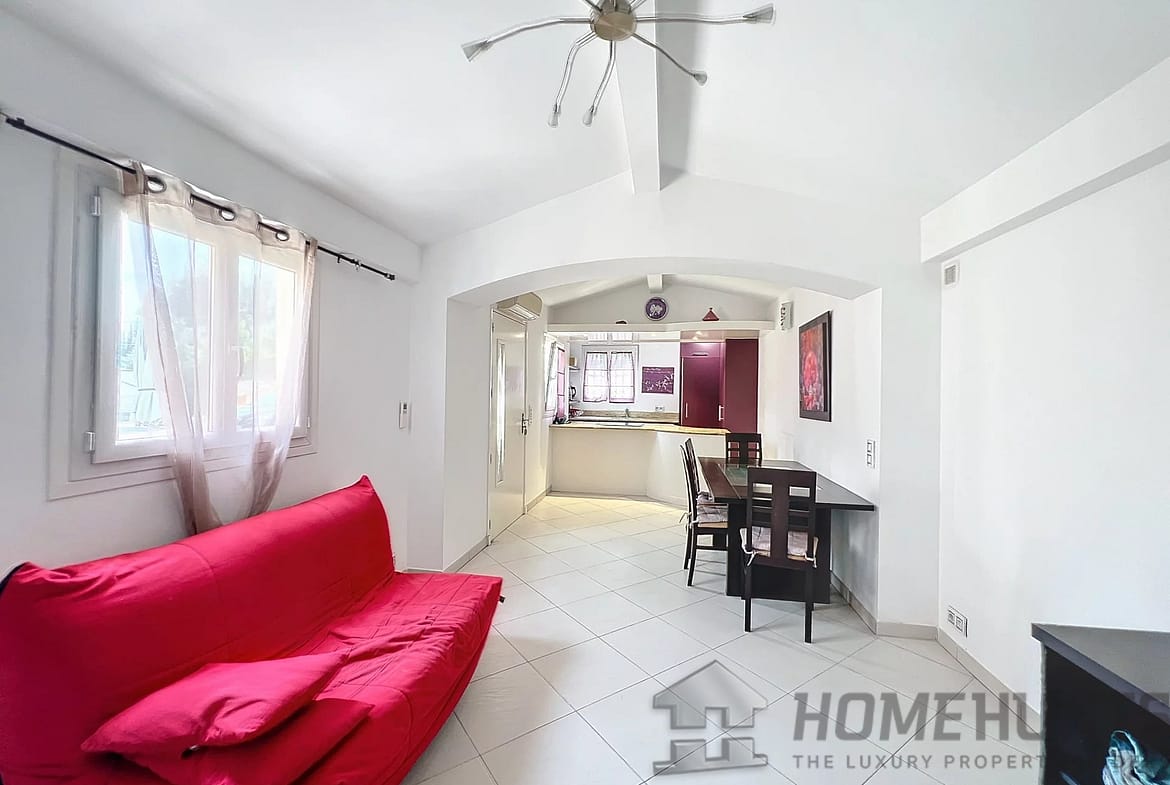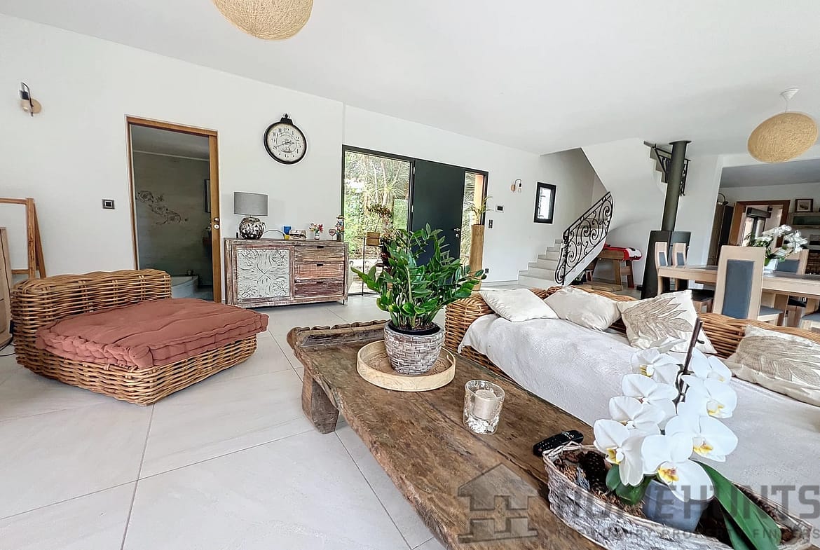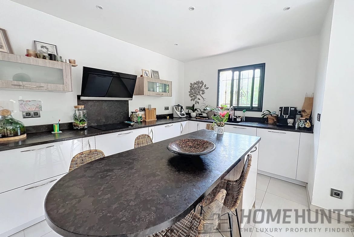 There’s a large graveled driveway and parking area next to the main 150 m2 villa with a vast 70 m2 living room/kitchen, 4 bedrooms, a shower room and a bathroom, opening on one side on a charming patio with palm tree and pound, and on a covered terrace and the pool on the other side, and a 3 room 56 m2 independent apartment just perfect for visiting guests.