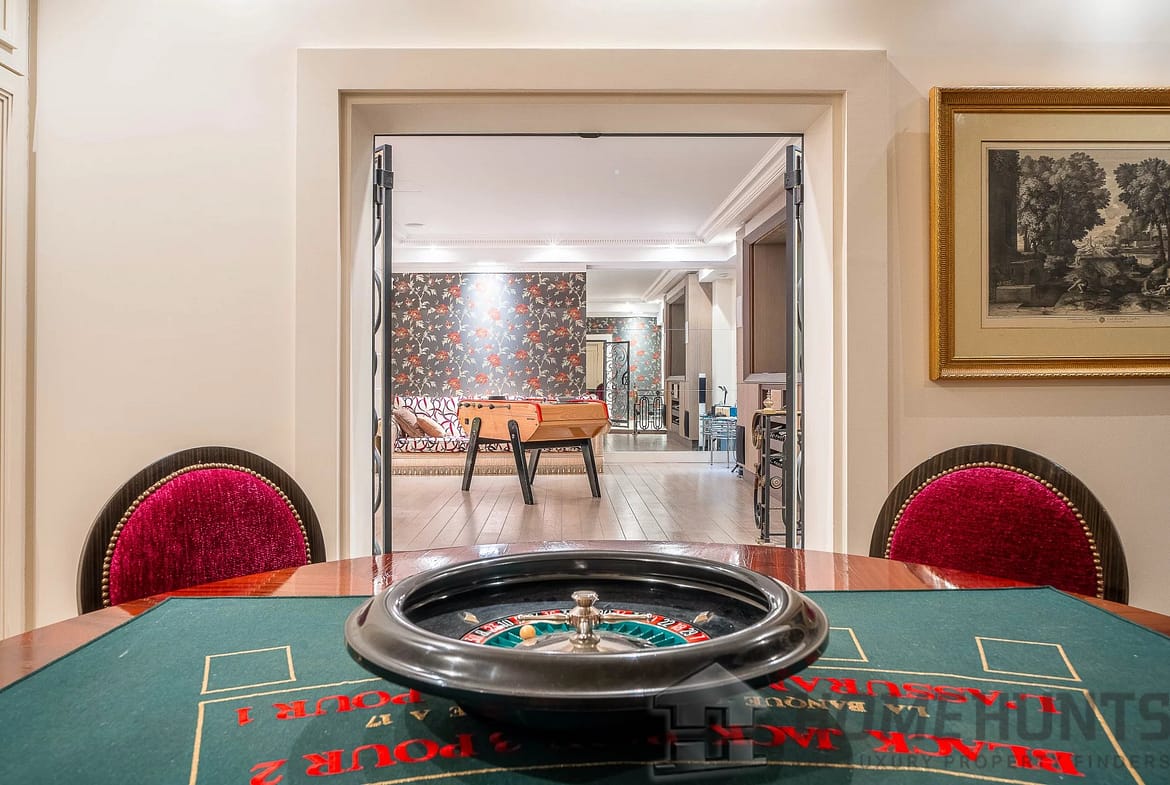 A relaxation area that includes a games room, gym, sauna, shower, and a home cinema.